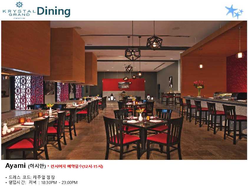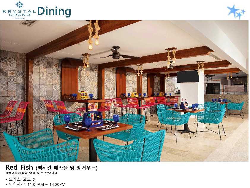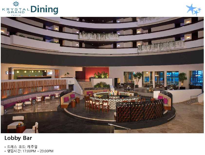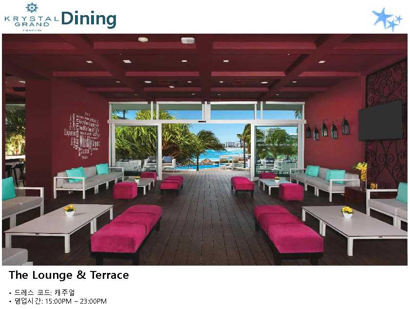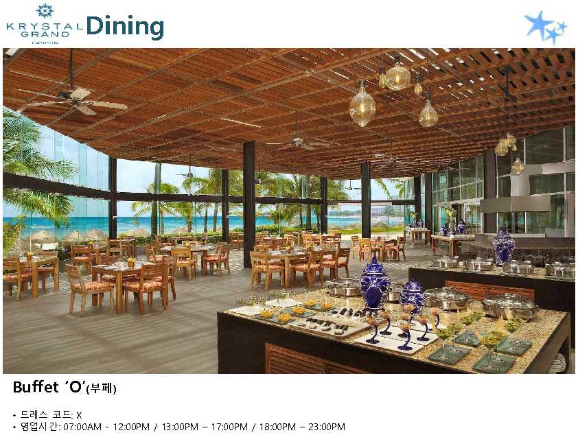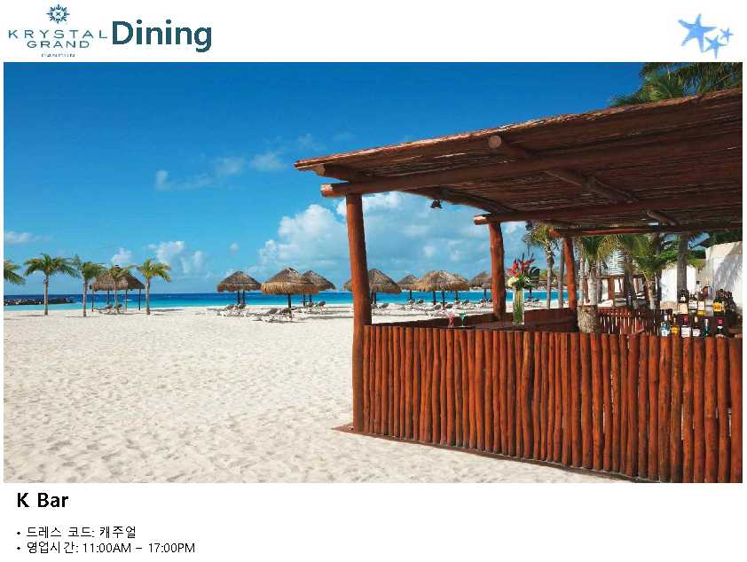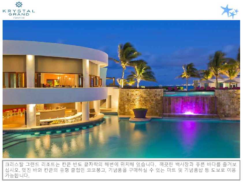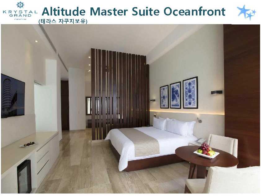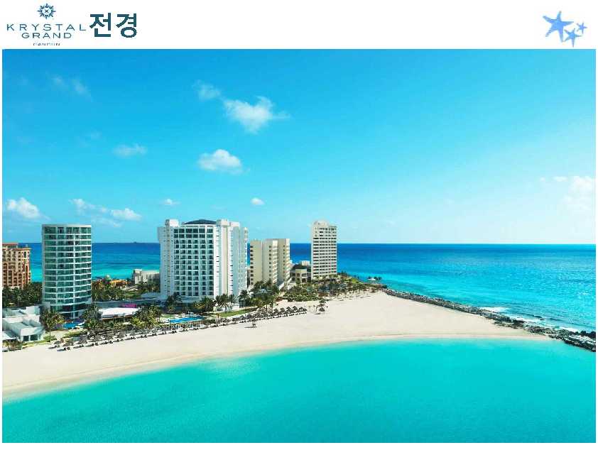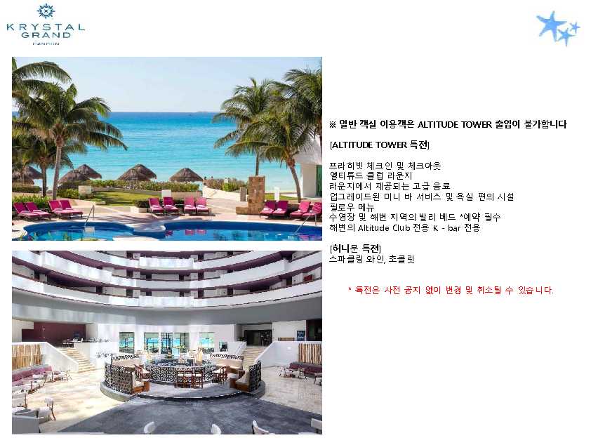 | 포함사항 | 1. 칸쿤 숙박 요금 2. 리조트 조.중.석식 및 음료, 주류 포함 (All Inclusive Resort) ※ 왕복 픽업 차량 이용 금액 (칸쿤 리조트 4박 이상 이용 시) * 공항 ▶ 크리스탈 얼티튜드 ▶ 공항 / 2인 $60 |