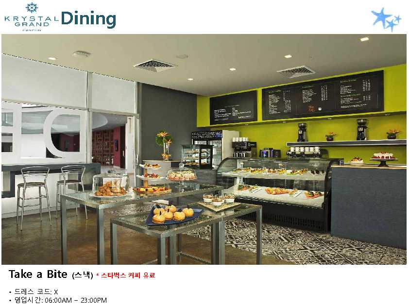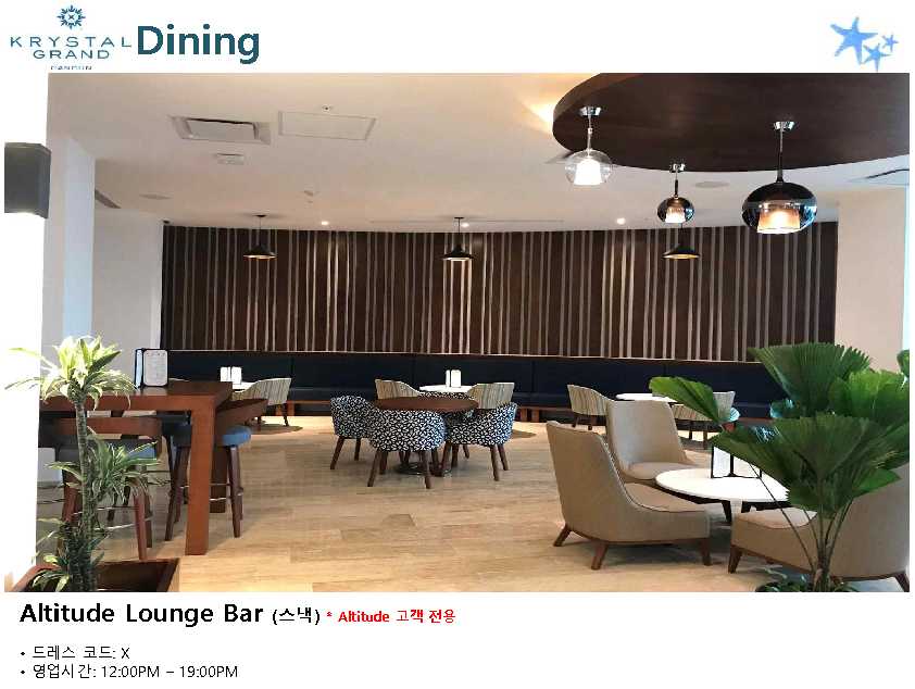 - Oasis Lounge: 열대 칵테일과 간단한 스낵을 즐길 수 있는 캐주얼 바.
