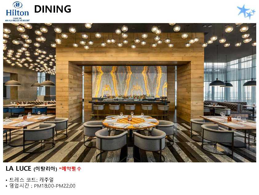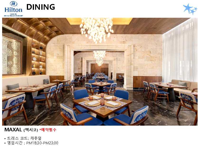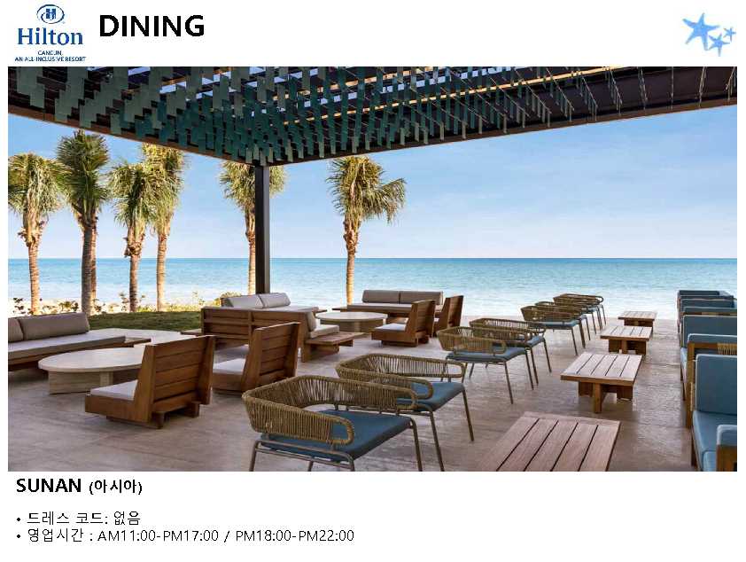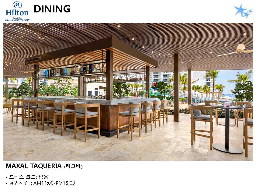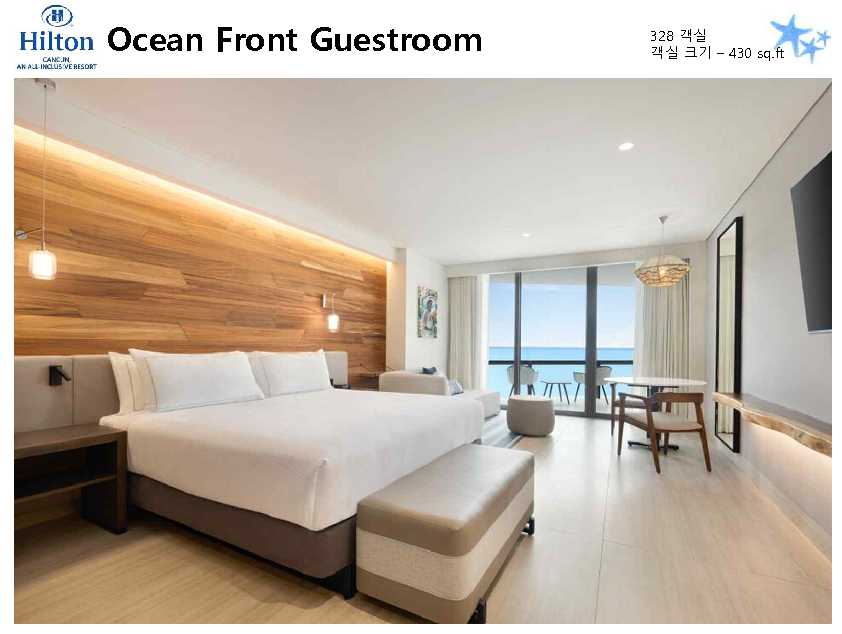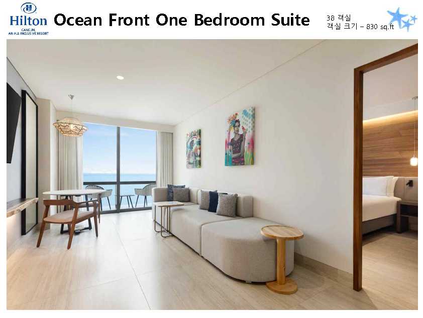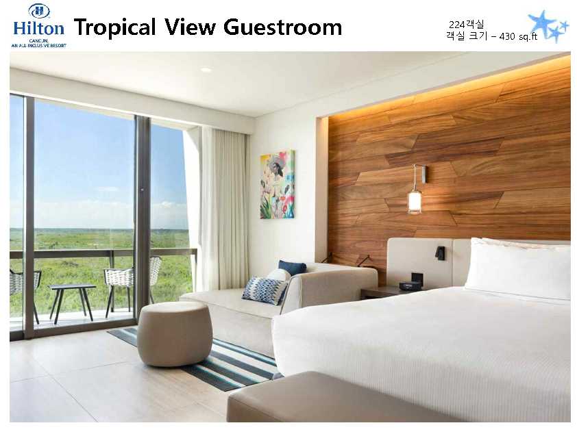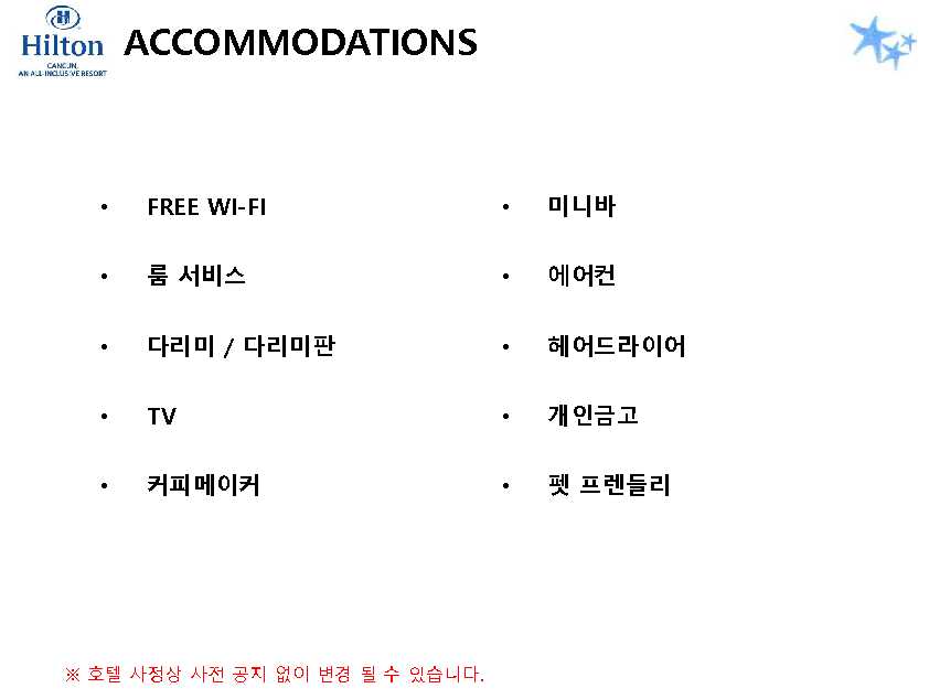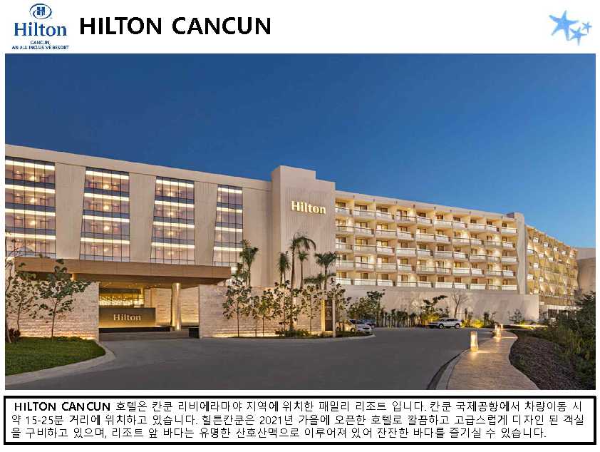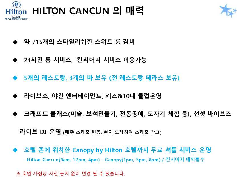 포함사항 | 1. 칸쿤 숙박 요금 2. 리조트 조.중.석식 및 음료, 주류 포함 (All Inclusive Resort) ※ 왕복 픽업 차량 이용 금액 (칸쿤 리조트 4박 이상 이용 시) * 공항 ▶ 힐튼 ▶ 공항 / 2인 $88 |