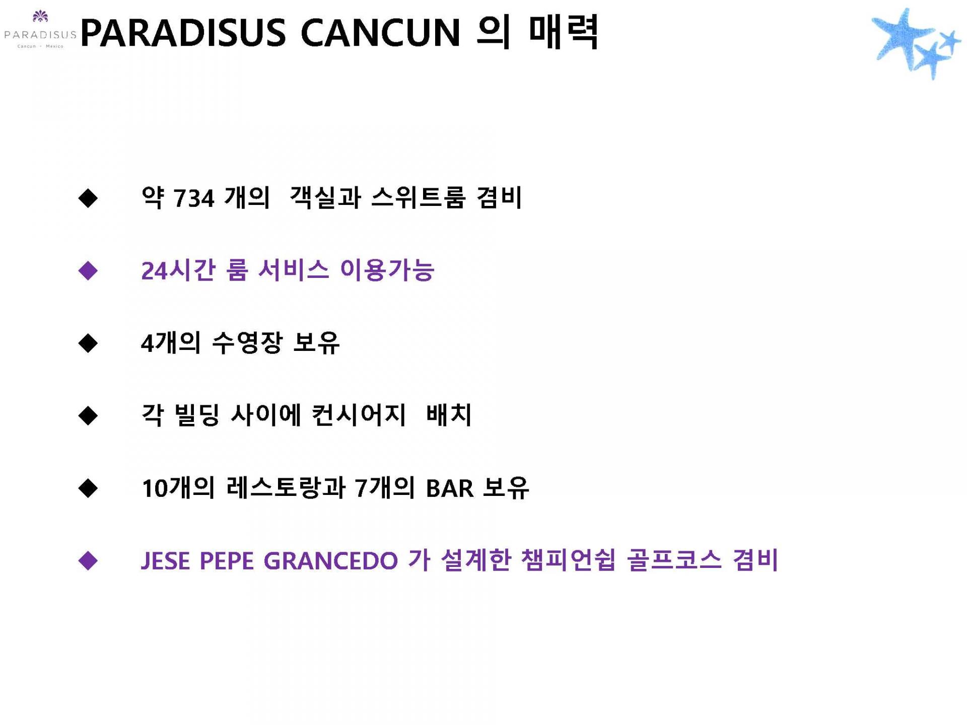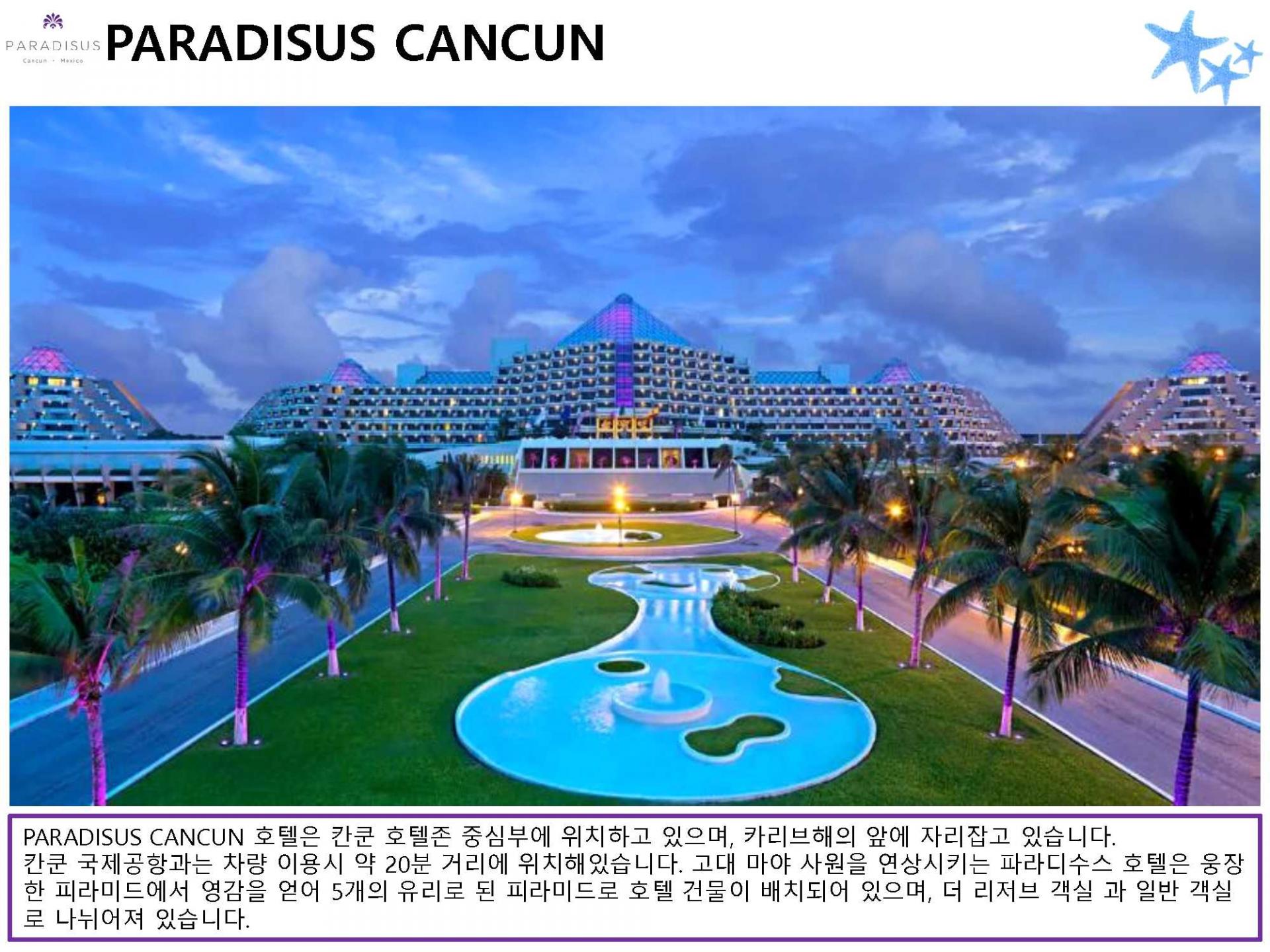 | 포함사항 | 1. 칸쿤 숙박요금. 2. 리조트 조.중.석식 및 음료, 주류 포함 (All Inclusive Resort) |