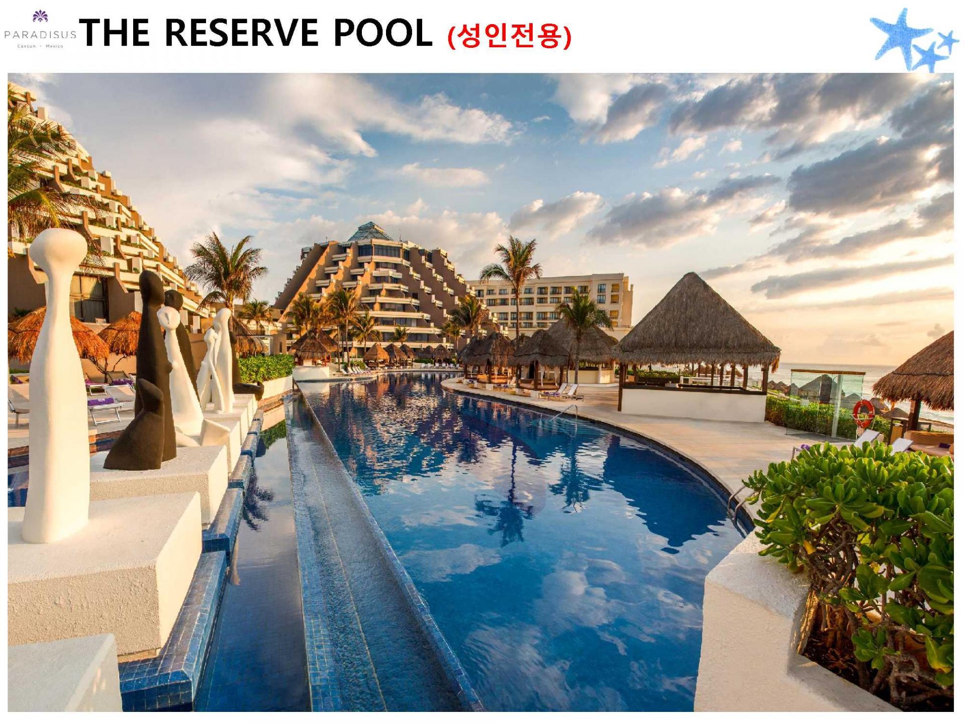 | The Reserve 만의 특전 | ·성인 전용 동 (피라미드 5번) .리조트 내에 The Reserve 전용 수영장과 전용 레스토랑이 있습니다. ·추가 요금이 발생하는 Sal Steak Cave 레스토랑에서 1회 저녁식사 무료 이용 가능합니다. ·전용 라운지에서 프리미엄 음료와 주류를 즐길 수 있습니다. |