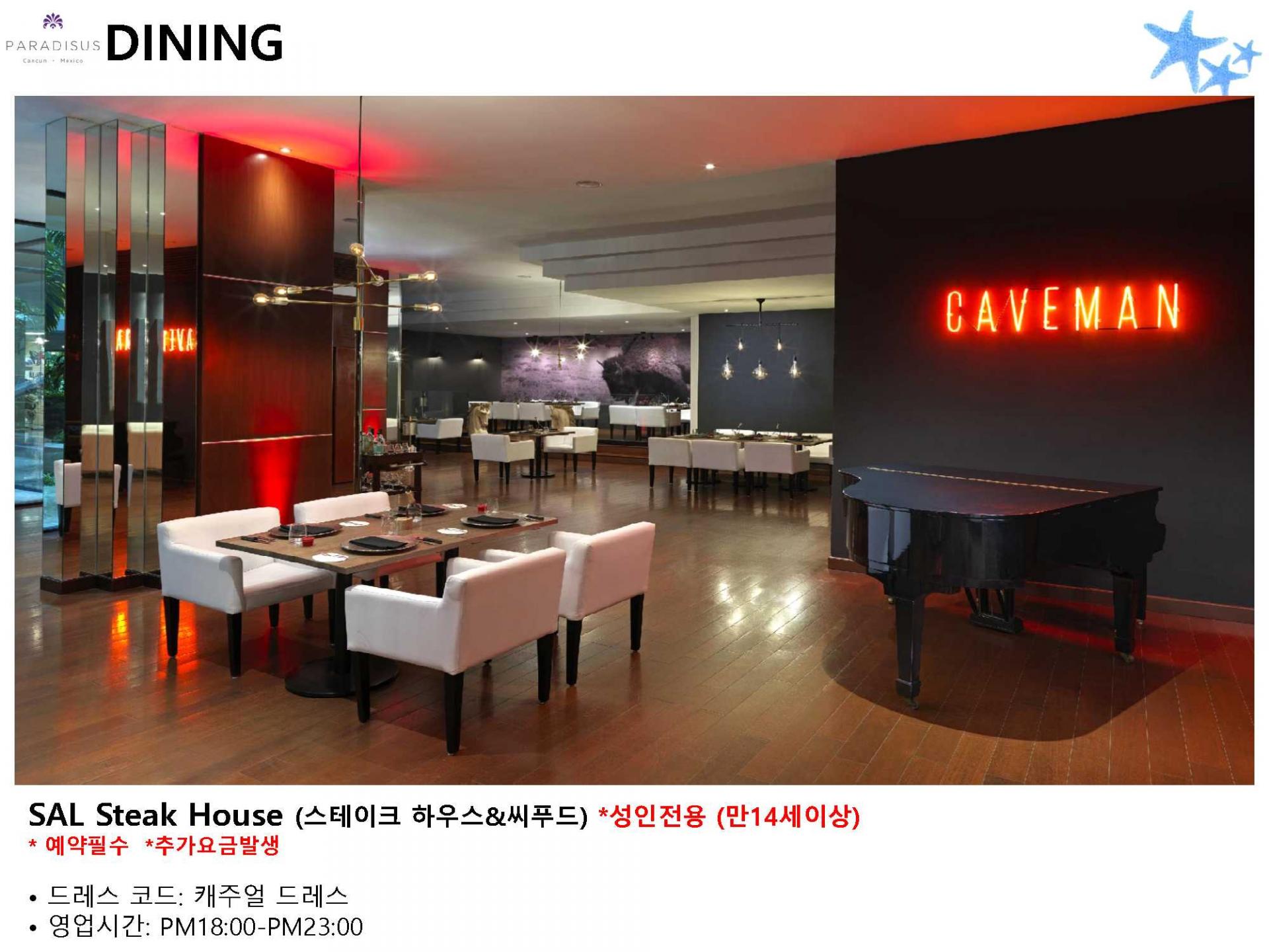 - Sal Steak Cave: 최고급 스테이크와 프리미엄 와인을 즐길 수 있는 시그니처 레스토랑.