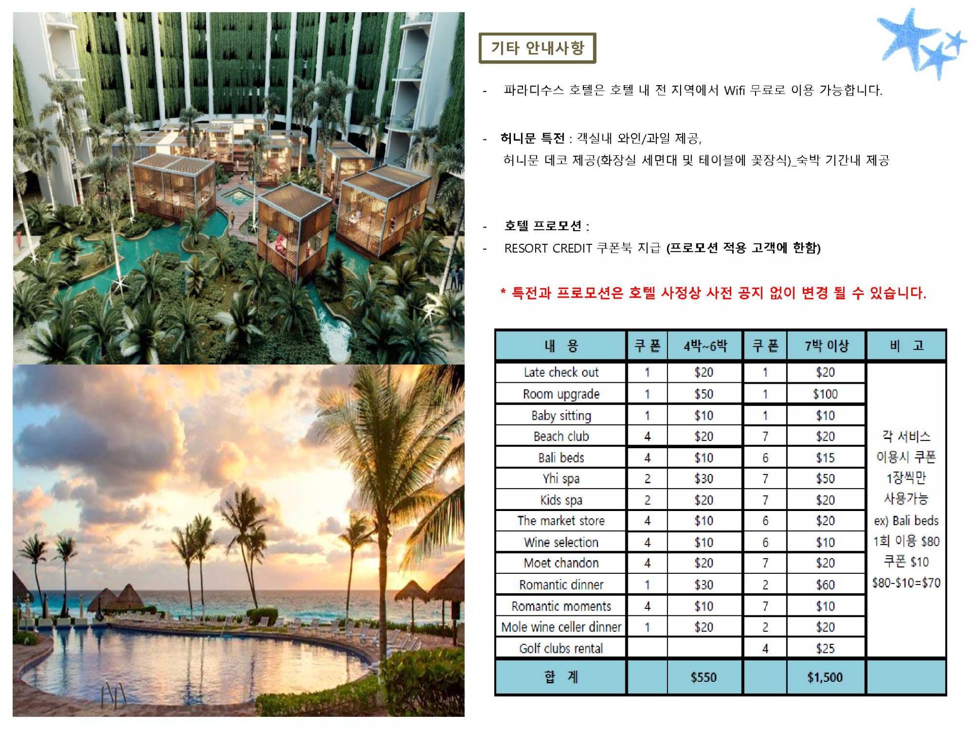 칸쿤 한 곳 또는 칸쿤 + 주변 리조트 포함하여 총 3~4박 이상 숙박 시 혜택 적용
