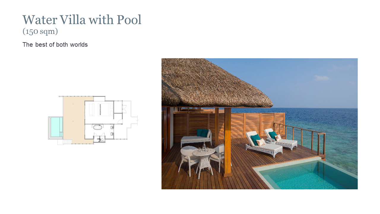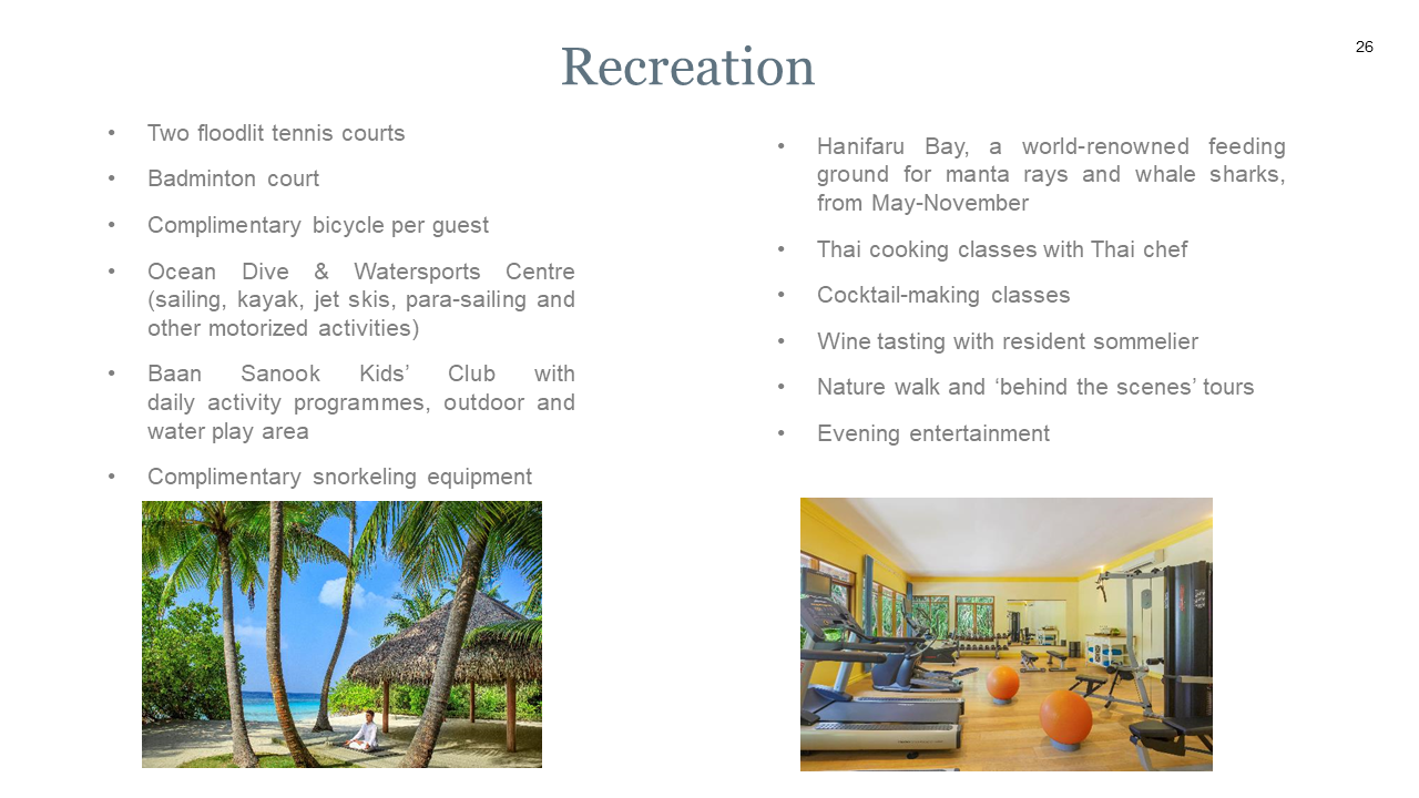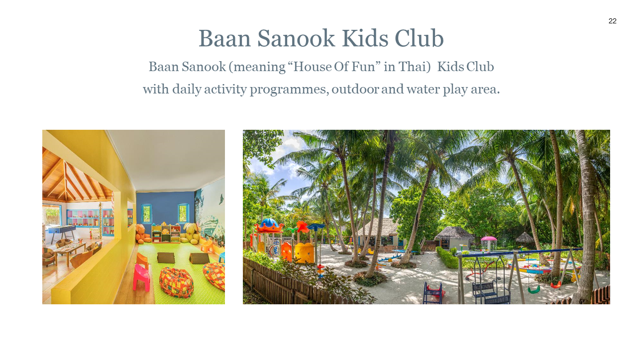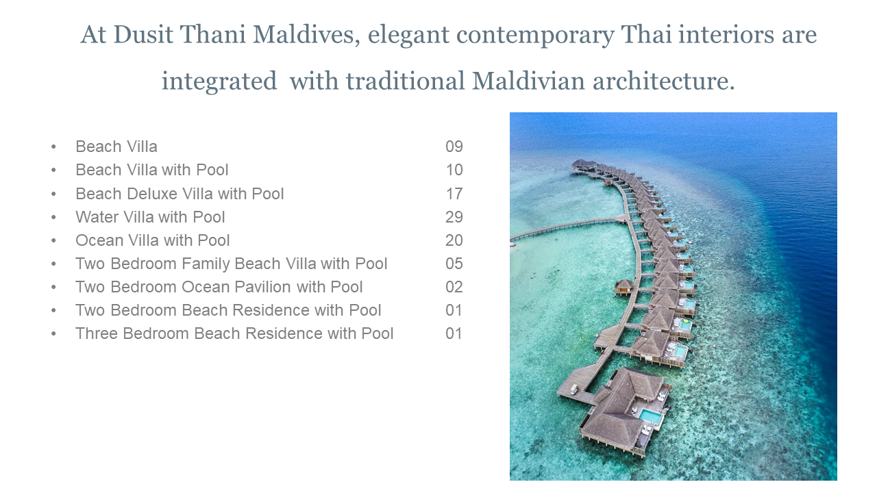 태국식 환대 서비스와 몰디브 전통 스타일이 조화를 이루는 럭셔리 휴양지입니다.