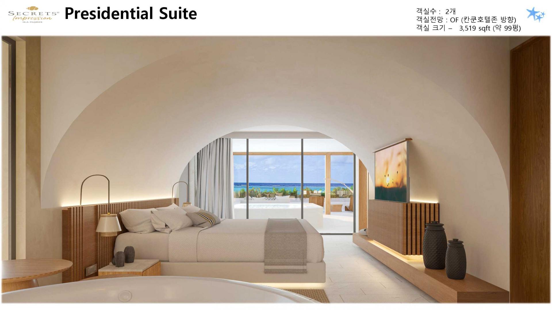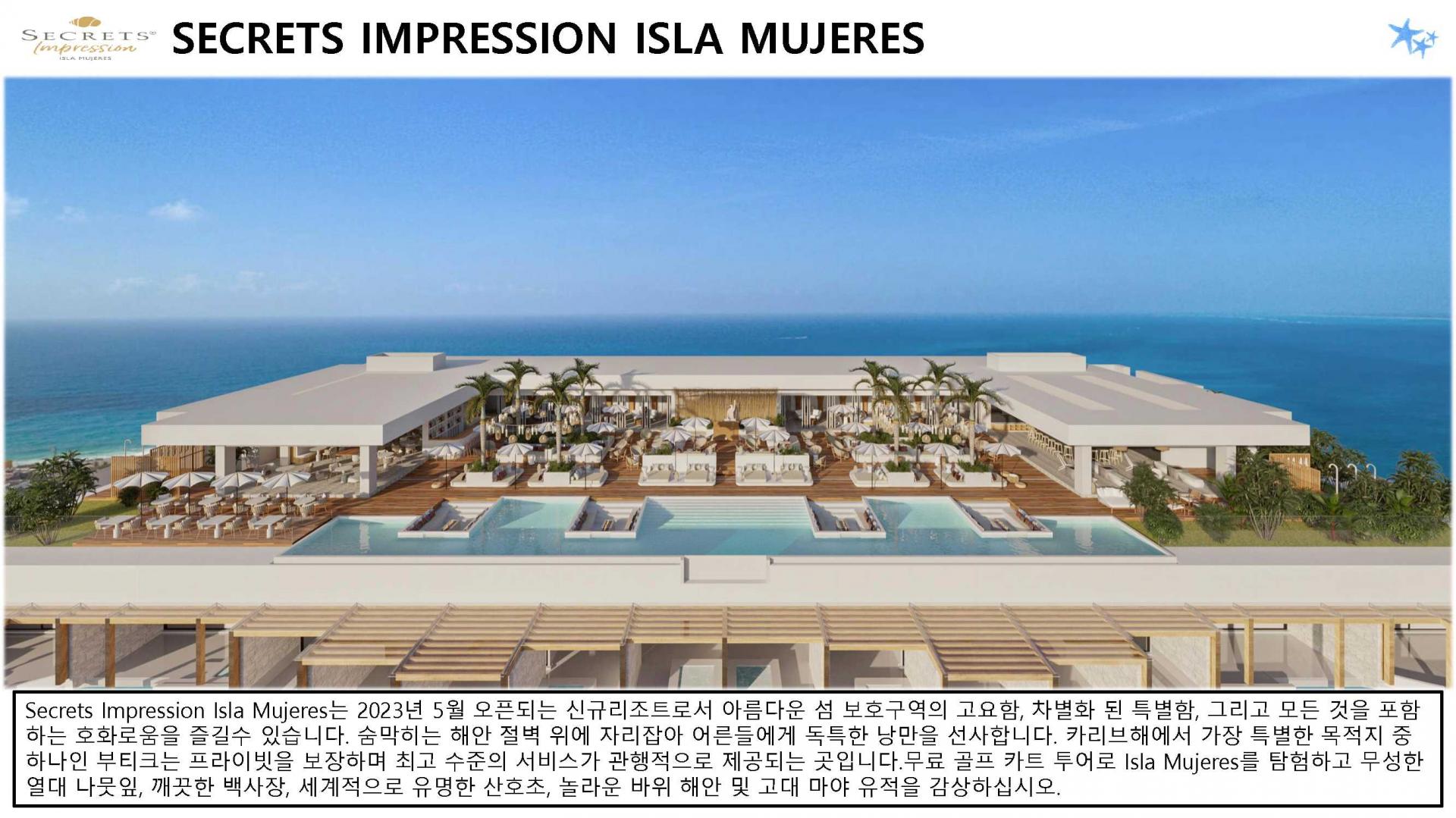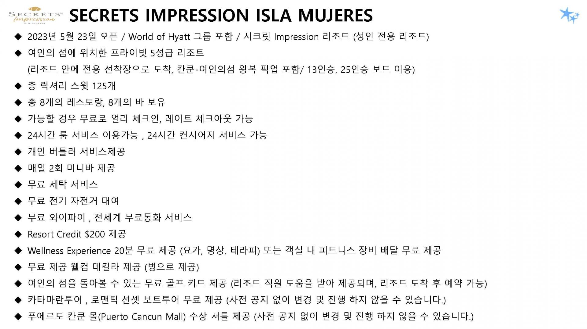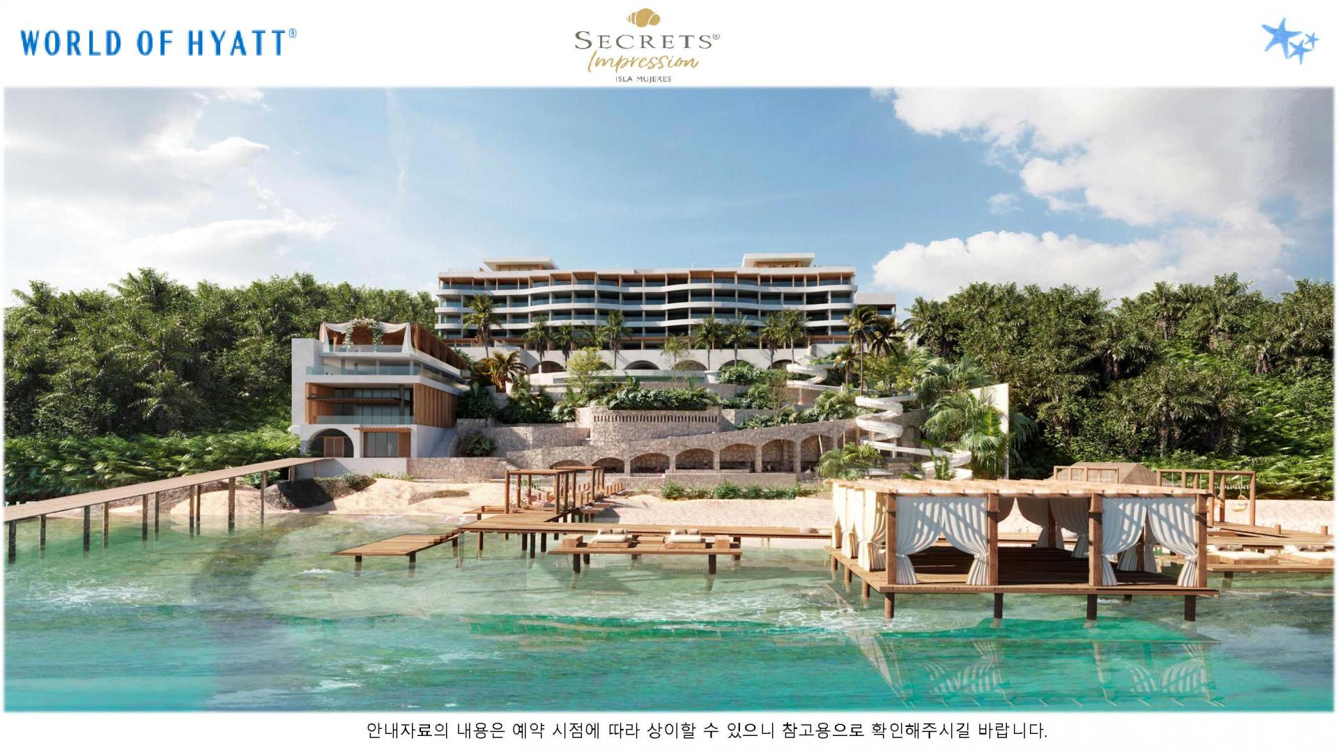 리조트 특징 | * 2023년 5월 23일 오픈 / World of Hyatt 그룹 포함 * 시크릿 계열 중 최상위 브랜드 Impression 리조트 * 여인의 섬에 위치한 프라이빗 5성급 리조트 (리조트 안 전용 선착장으로 도착, 칸쿤-여인의섬 왕복 픽업 포함/ 13인승, 25인승 보트 이용) * 총 럭셔리 스윗 125개 * 총 8개의 레스토랑, 8개의 바 보유 * 객실 가능할 경우 무료로 얼리 체크인, 레이트 체크 아웃 가능 * 24시간 룸 서비스 이용가능 |