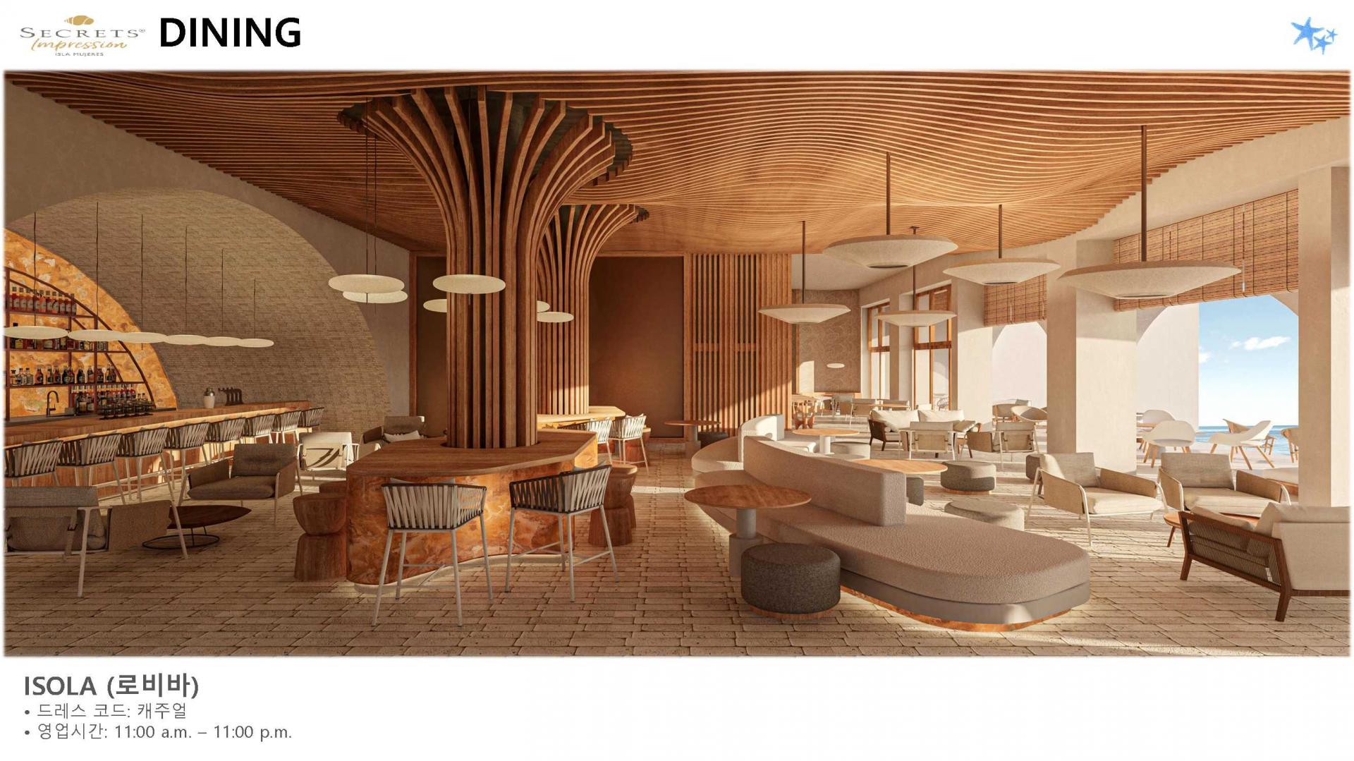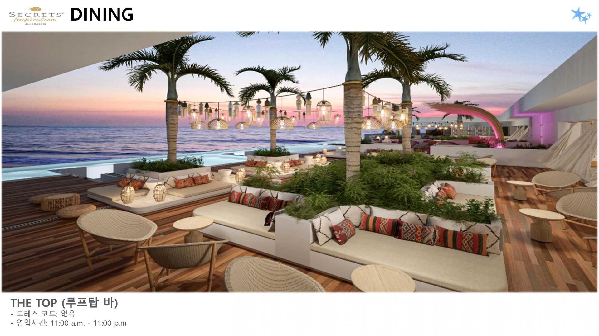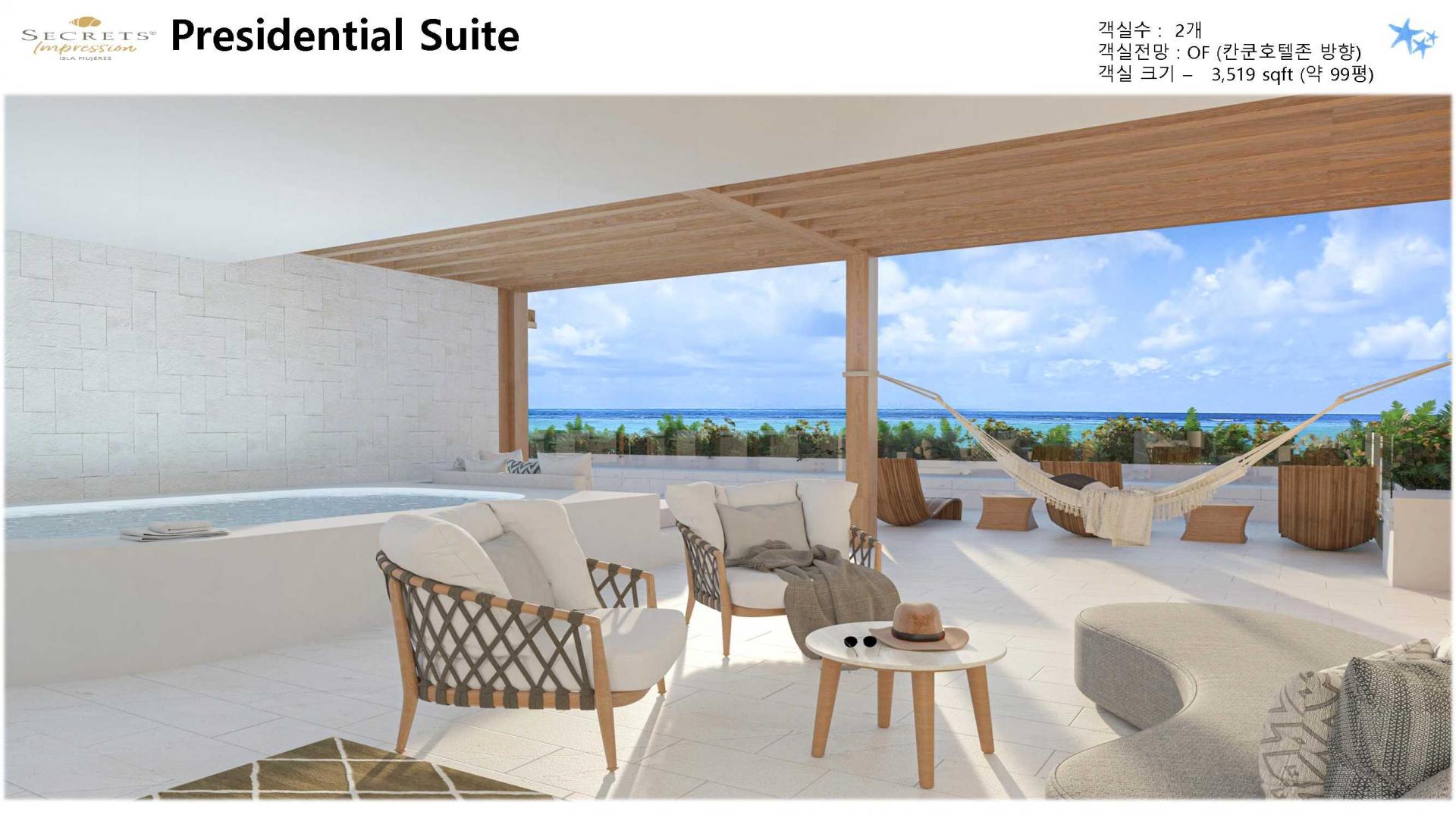 리조트 특징 | * 2023년 5월 23일 오픈 / World of Hyatt 그룹 포함 * 시크릿 계열 중 최상위 브랜드 Impression 리조트 * 여인의 섬에 위치한 프라이빗 5성급 리조트 (리조트 안 전용 선착장으로 도착, 칸쿤-여인의섬 왕복 픽업 포함/ 13인승, 25인승 보트 이용) * 총 럭셔리 스윗 125개 * 총 8개의 레스토랑, 8개의 바 보유 * 객실 가능할 경우 무료로 얼리 체크인, 레이트 체크 아웃 가능 * 24시간 룸 서비스 이용가능 |