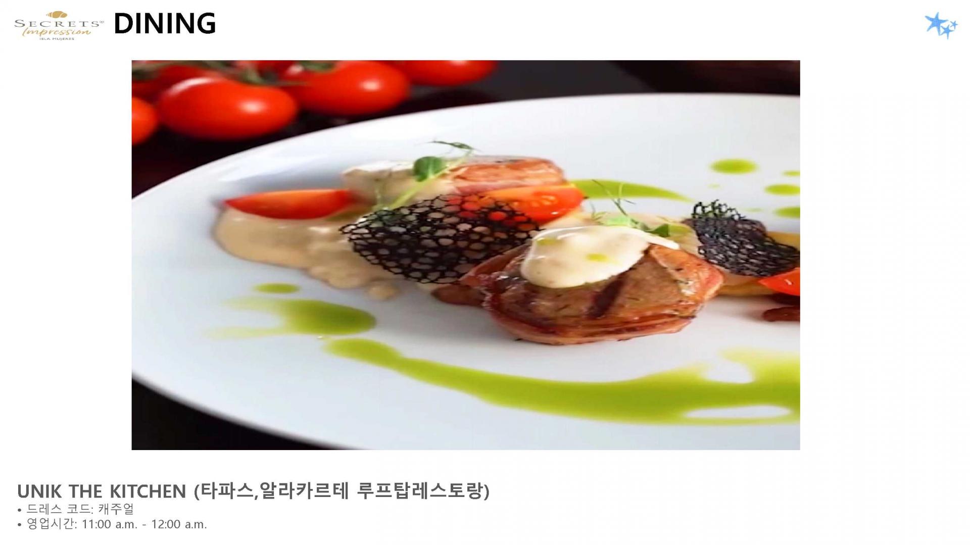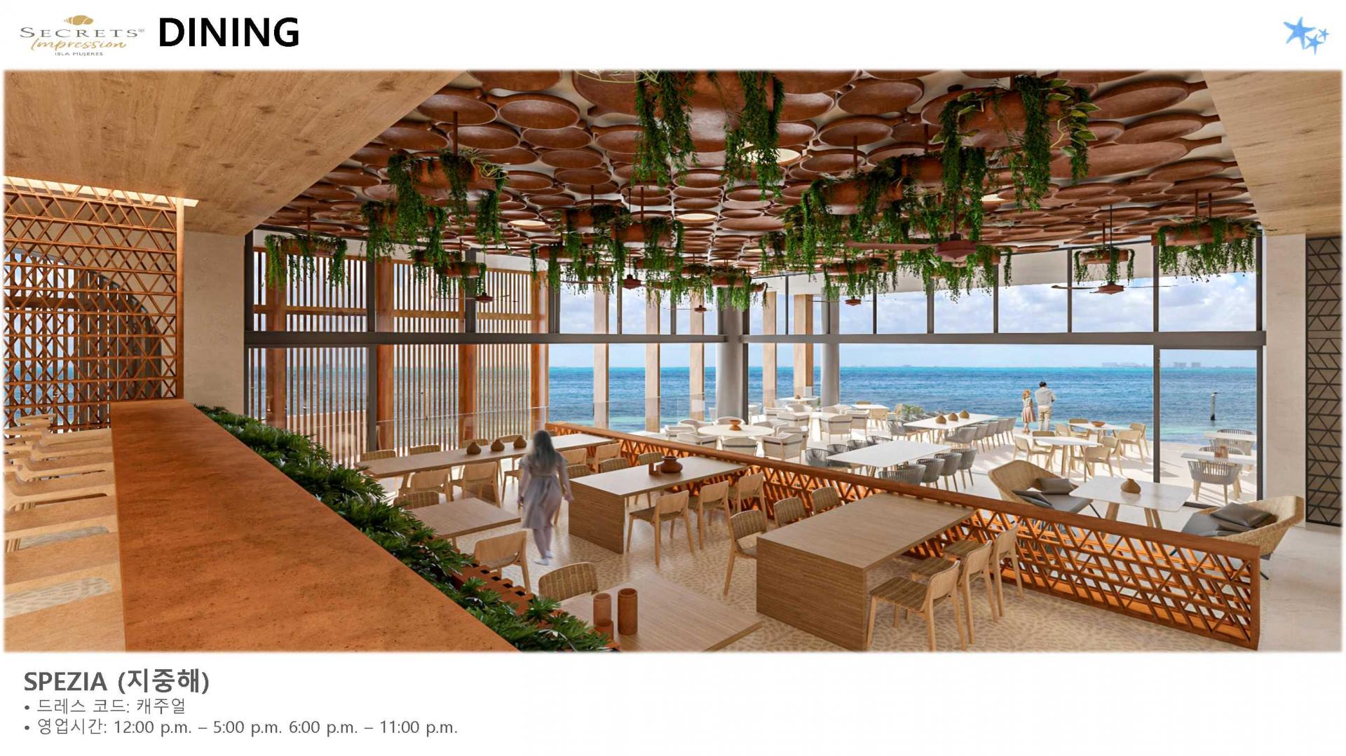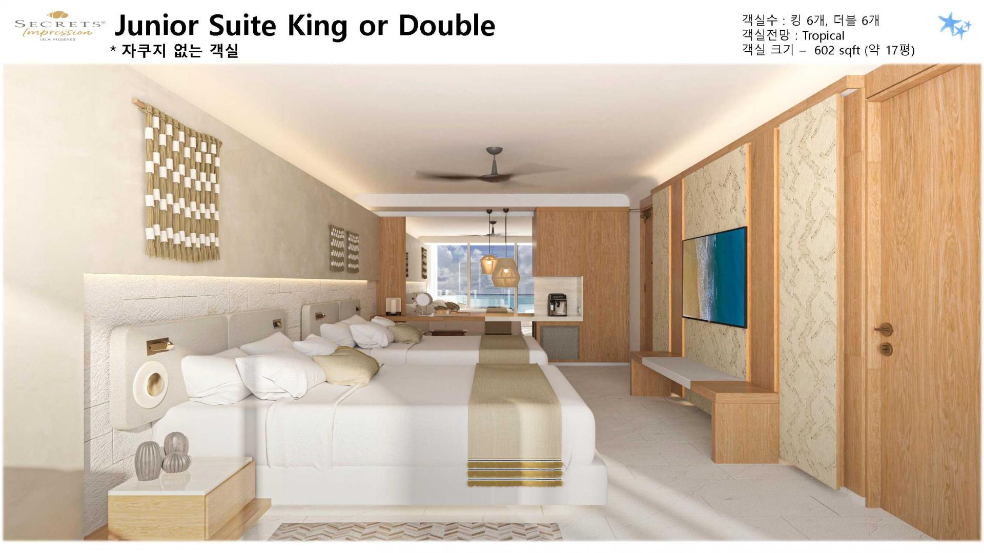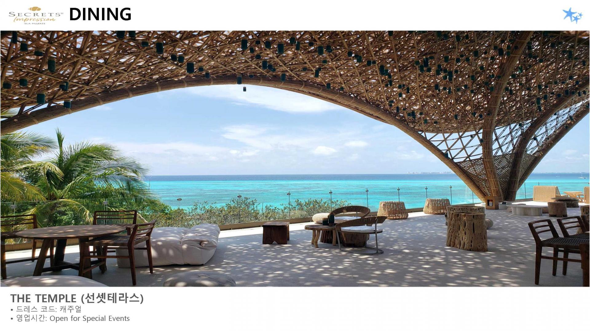 리조트 특징 | * 2023년 5월 23일 오픈 / World of Hyatt 그룹 포함 * 시크릿 계열 중 최상위 브랜드 Impression 리조트 * 여인의 섬에 위치한 프라이빗 5성급 리조트 (리조트 안 전용 선착장으로 도착, 칸쿤-여인의섬 왕복 픽업 포함/ 13인승, 25인승 보트 이용) * 총 럭셔리 스윗 125개 * 총 8개의 레스토랑, 8개의 바 보유 * 객실 가능할 경우 무료로 얼리 체크인, 레이트 체크 아웃 가능 * 24시간 룸 서비스 이용가능 |