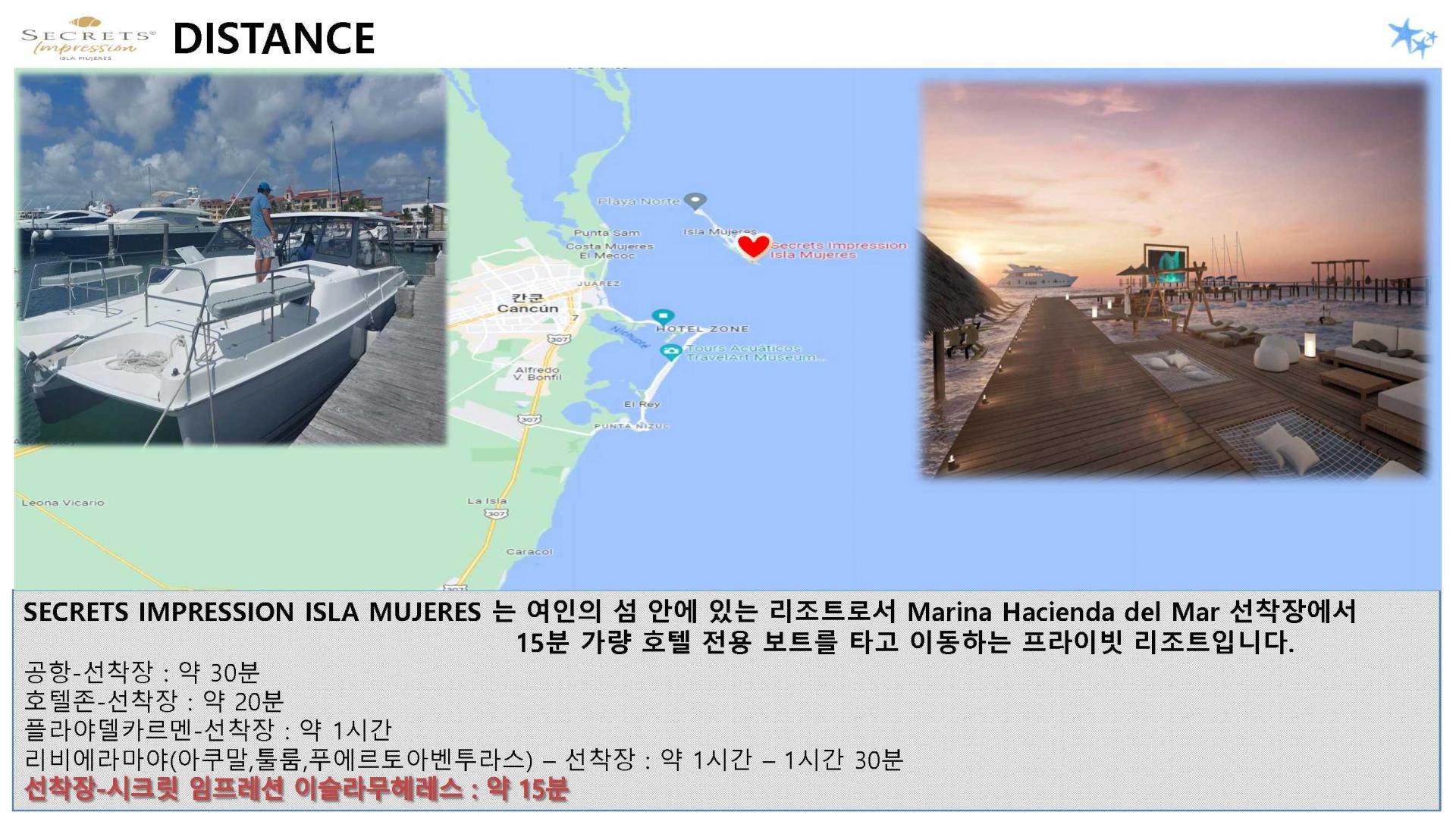 **칸쿤 국제공항(CUN)**에서 Secrets Impression Isla Mujeres까지의 이동 시간은 약 1시간 30분~2시간 정도 소요됩니다.