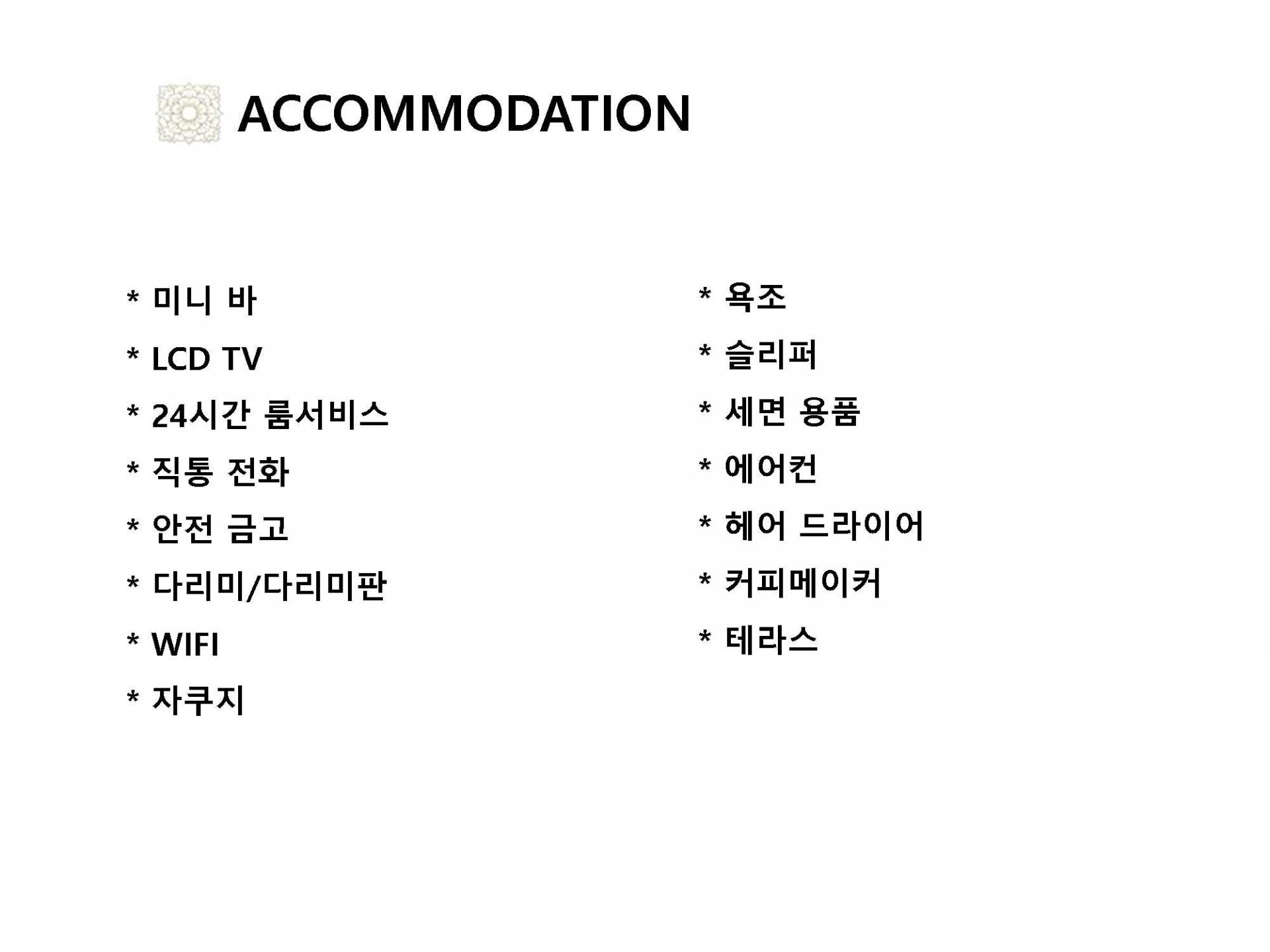 허니문 특전 | 1. 꽃 장식 2. 스파클링 와인 3. 딸기 초콜렛 (특전은 호텔 사정 상 사전 공지 없이 변경 될 수 있습니다.) |