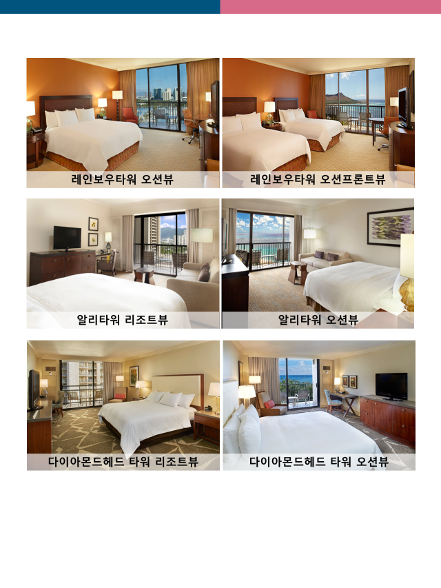 5개의 타워(레인보우 타워, 알리이 타워, 타파 타워, 그랜드 와이키키안, 카리아 타워)**로 이루어져 있으며,각 타워별로 다양한 객실 및 스위트룸을 제공하여 모든 여행객의 니즈를 충족합니다.