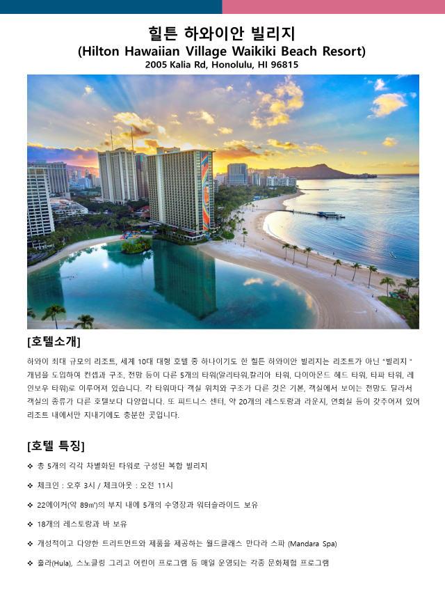 ※ 하와이 호텔은 날짜 별 금액 변동이 심한 지역으로 반드시 담당자 확인 후 진행하심을 요청 드립니다.