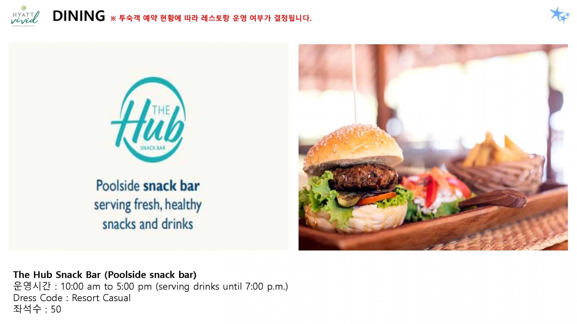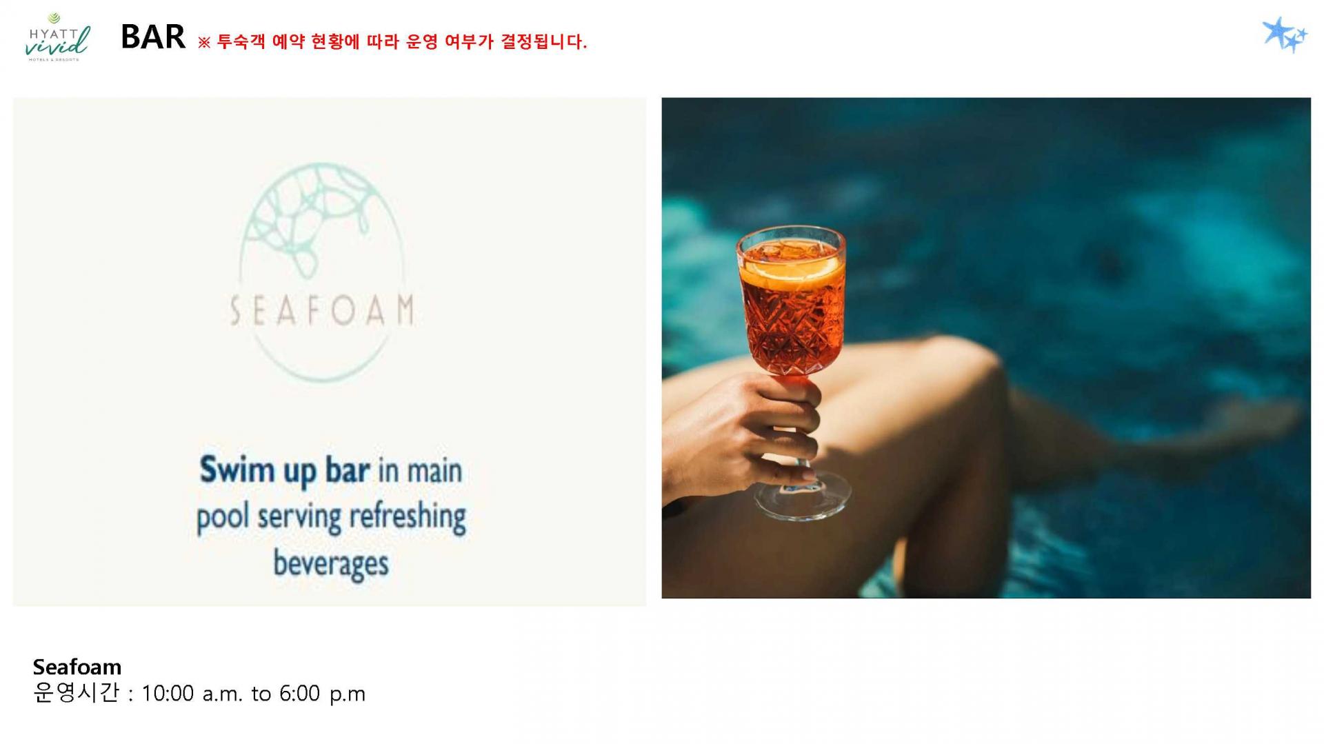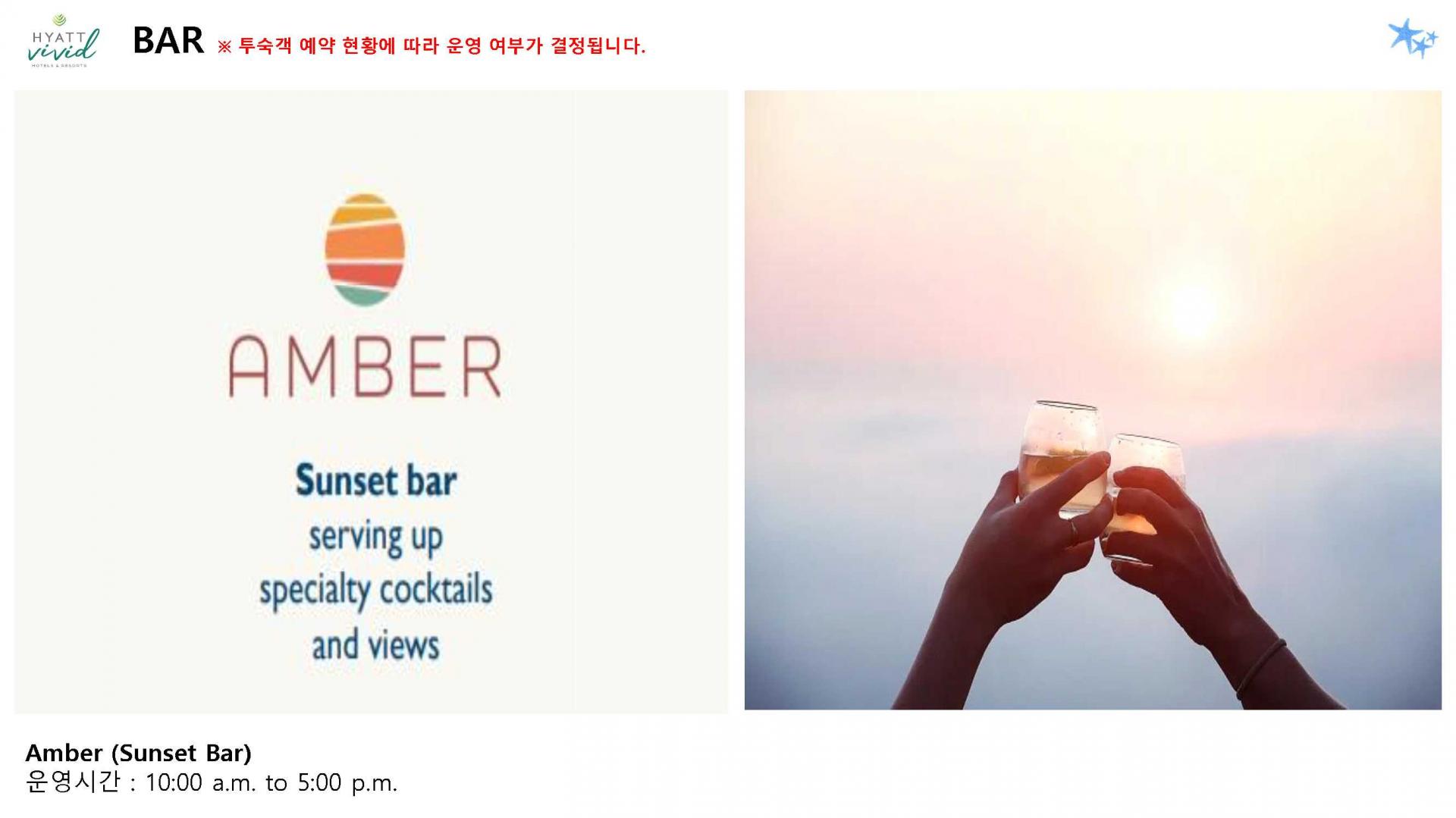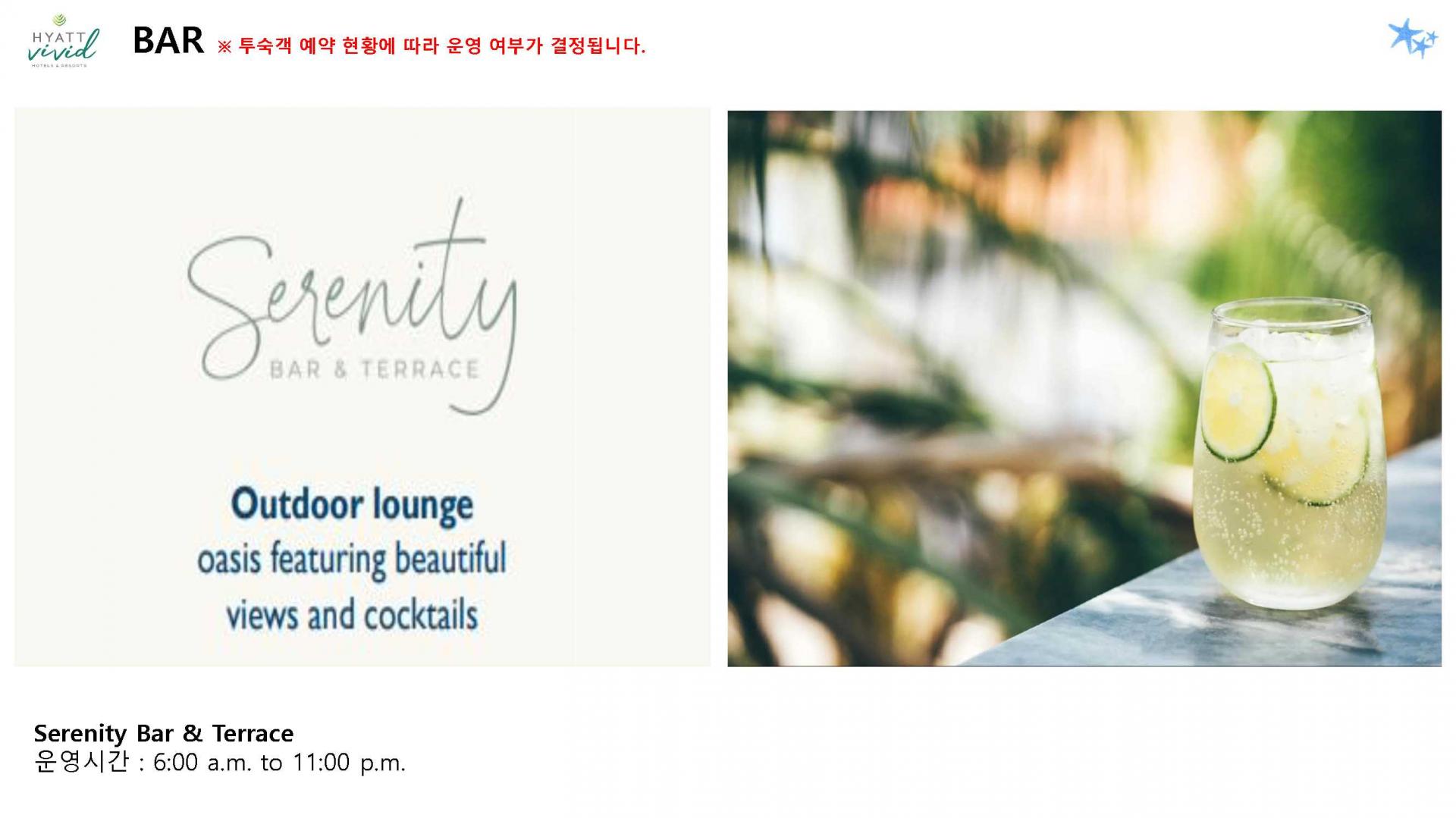 | 리조트특전 (허니문일경우) | 1. 과일 2. 스파클링 와인 1병 3. 스페셜 턴다운 서비스 1회 4. 스파 15% 할인 5. 룸 내 조식 제공 (사전 예약 필수) 룸 서비스 : 07:00 am ~ 11:00 am / 18:00 pm~23:00 pm 운영 |