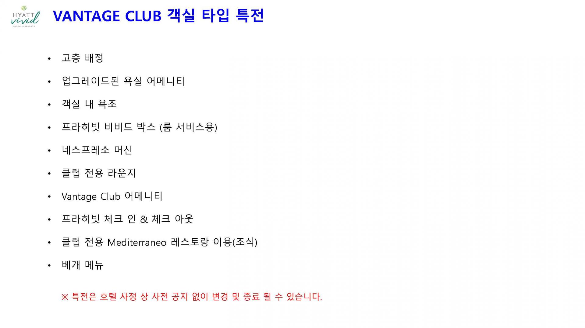| Vantage Club 객실 타입 특전! | 1. 고층 배정 (9층~11층) 2. 업그레이드된 욕실 어메니티 3. Pillow Menu 4. 프라히빗 비비드 박스 (룸서비스용) 5. 네스프레소머신 6. 프라히빗 발코니 7. Vantage Club 어메니티 8. 프라히빗 체크 인 아웃 9. 클럽 전용 Mediterraneo 레스토랑 이용(조식) (특전은 호텔 사정 상 사전 공지 없이 변경 될 수 있습니다.) |