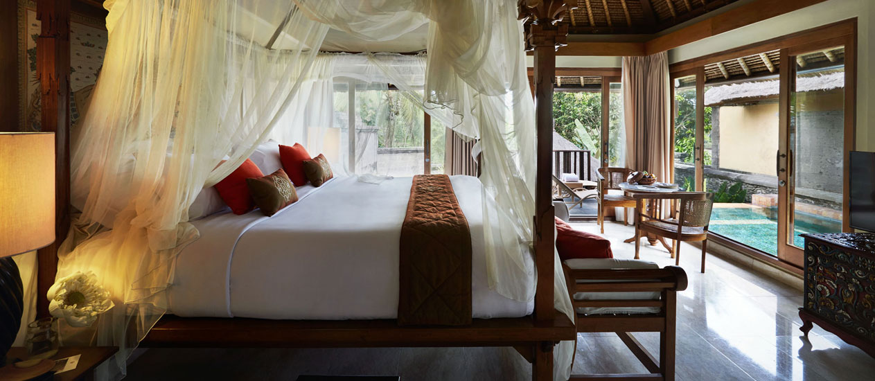 ✔️침실은 전통 사각 기둥형 킹베드 배치, 조식 전용 데이베드 ‘Bale Bengong’ 포함