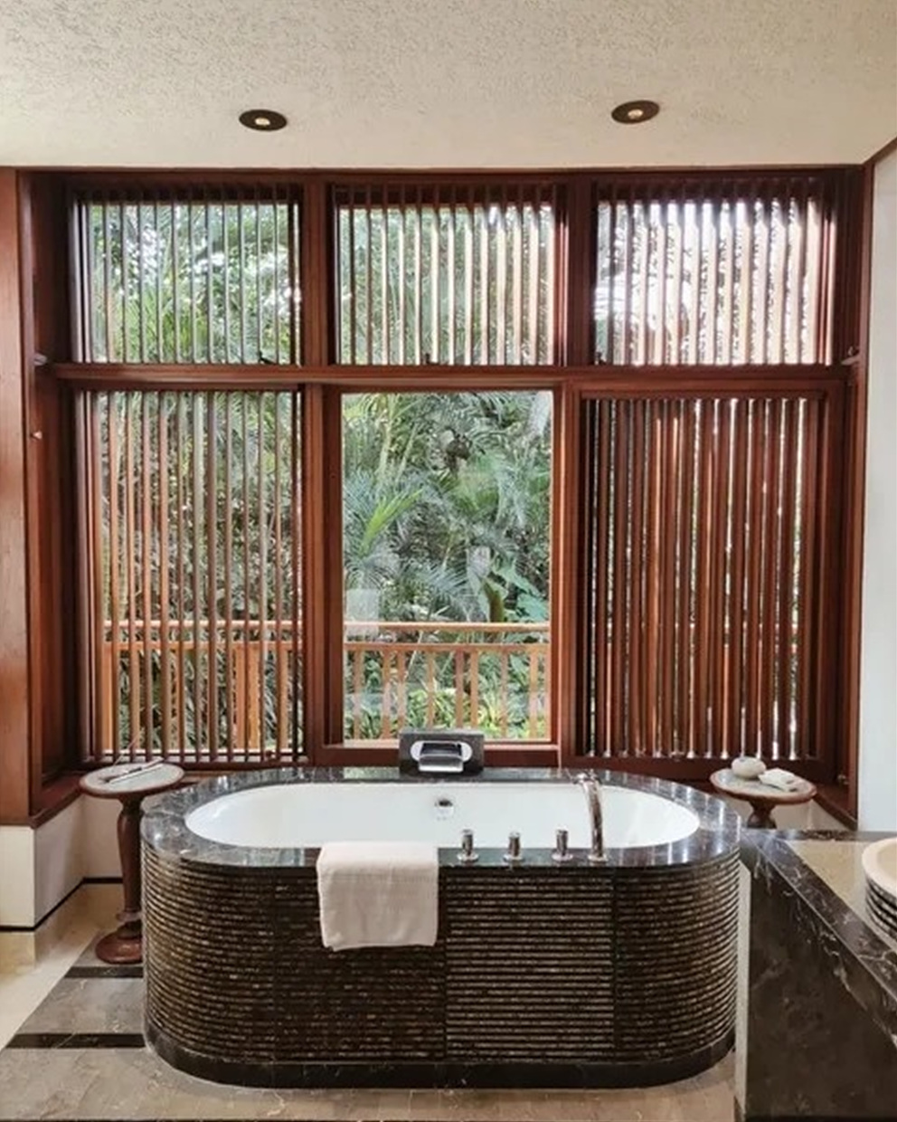 ✔️실내 욕실은 대리석과 프리스탠딩 욕조, 실내외 샤워를 갖춘 럭셔리 설계