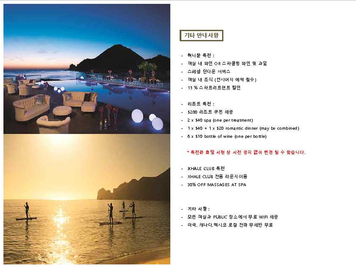 ※ 로스카보스 호텔은 날짜 별 금액 변동이 심한 지역으로 반드시 담당자 확인 후 진행하심을 요청 드립니다.