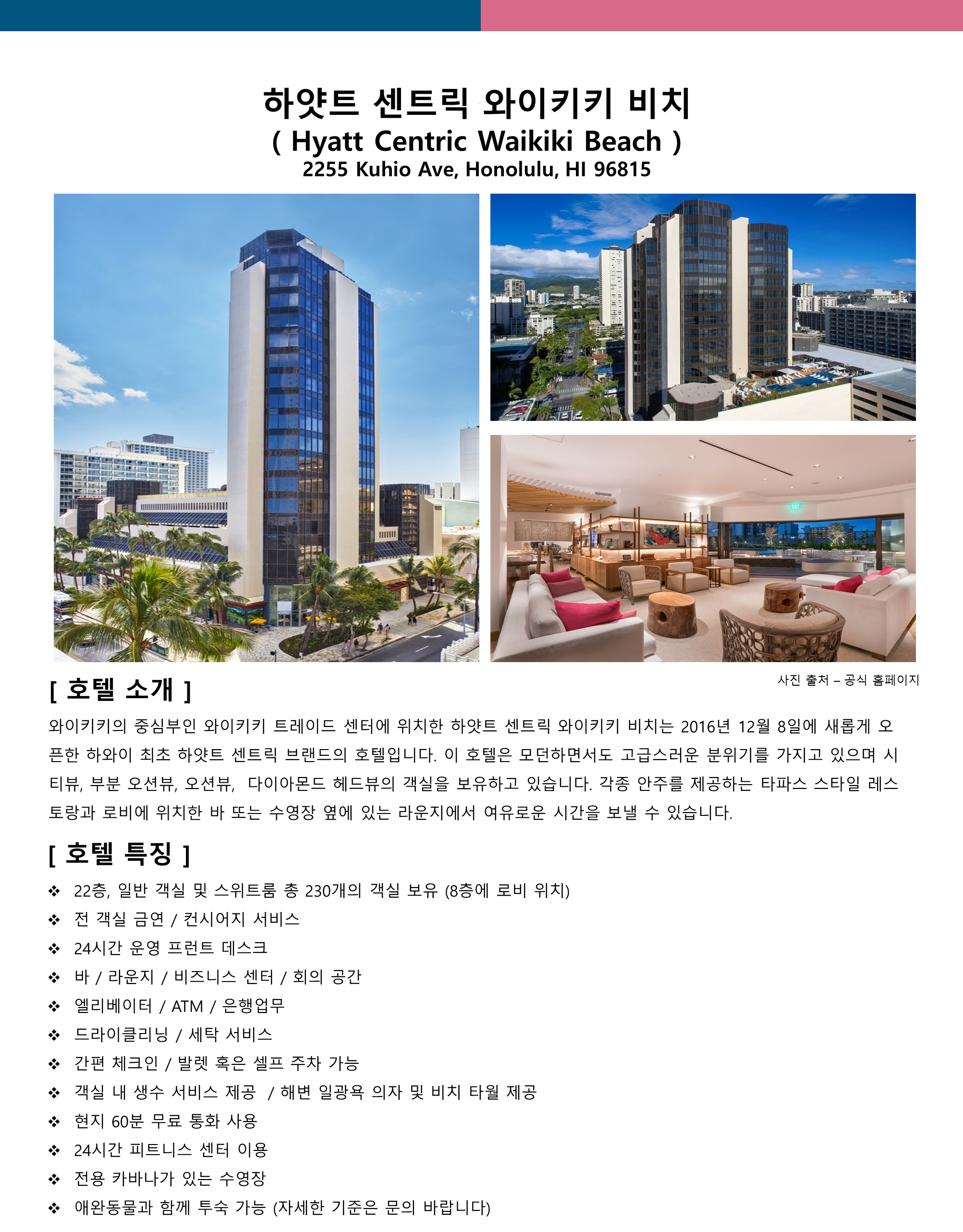 ※ 하와이 호텔은 날짜 별 금액 변동이 심한 지역으로 반드시 담당자 확인 후 진행하심을 요청 드립니다.