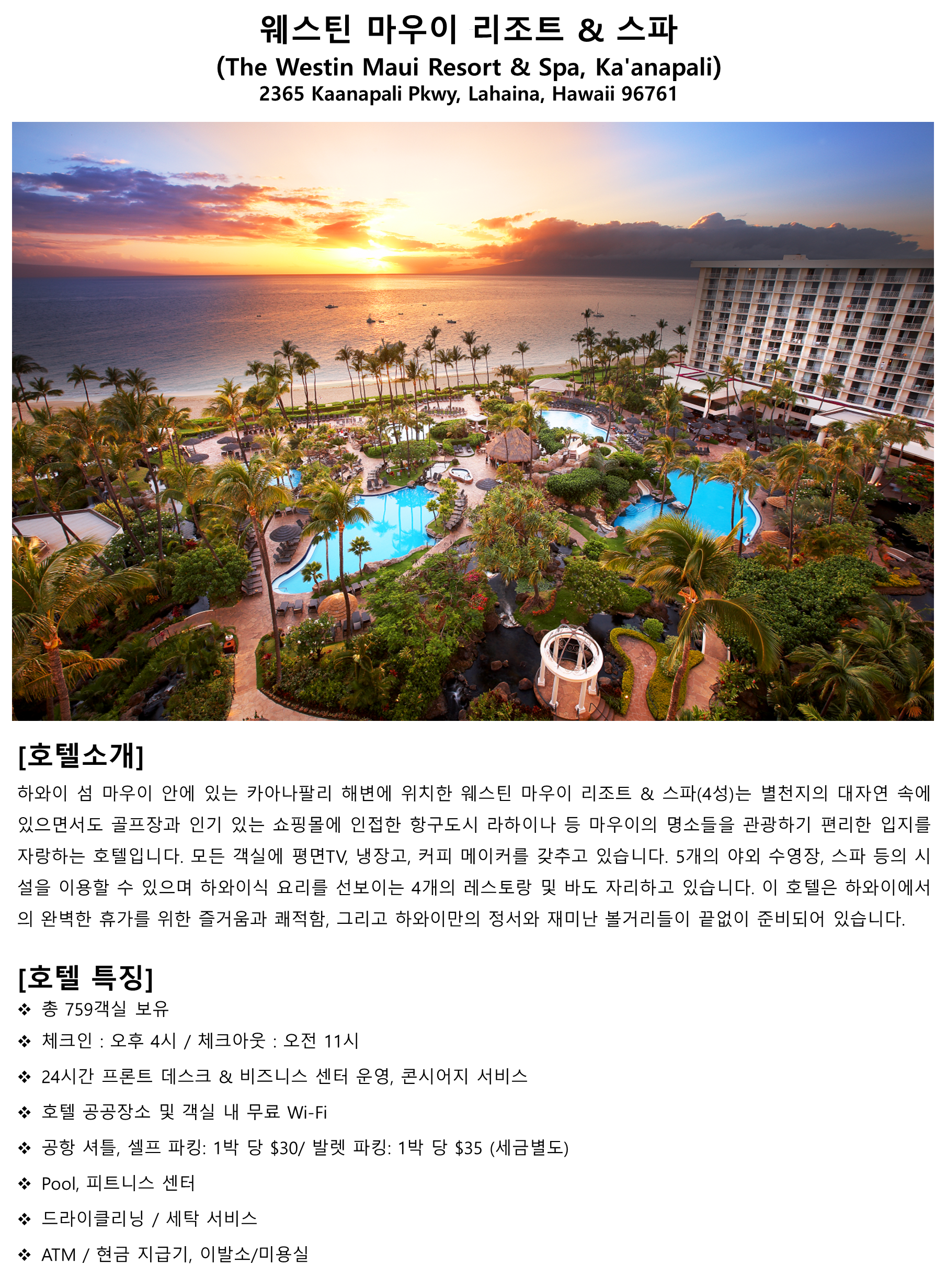 ※ 하와이 호텔은 날짜 별 금액 변동이 심한 지역으로 반드시 담당자 확인 후 진행하심을 요청 드립니다.