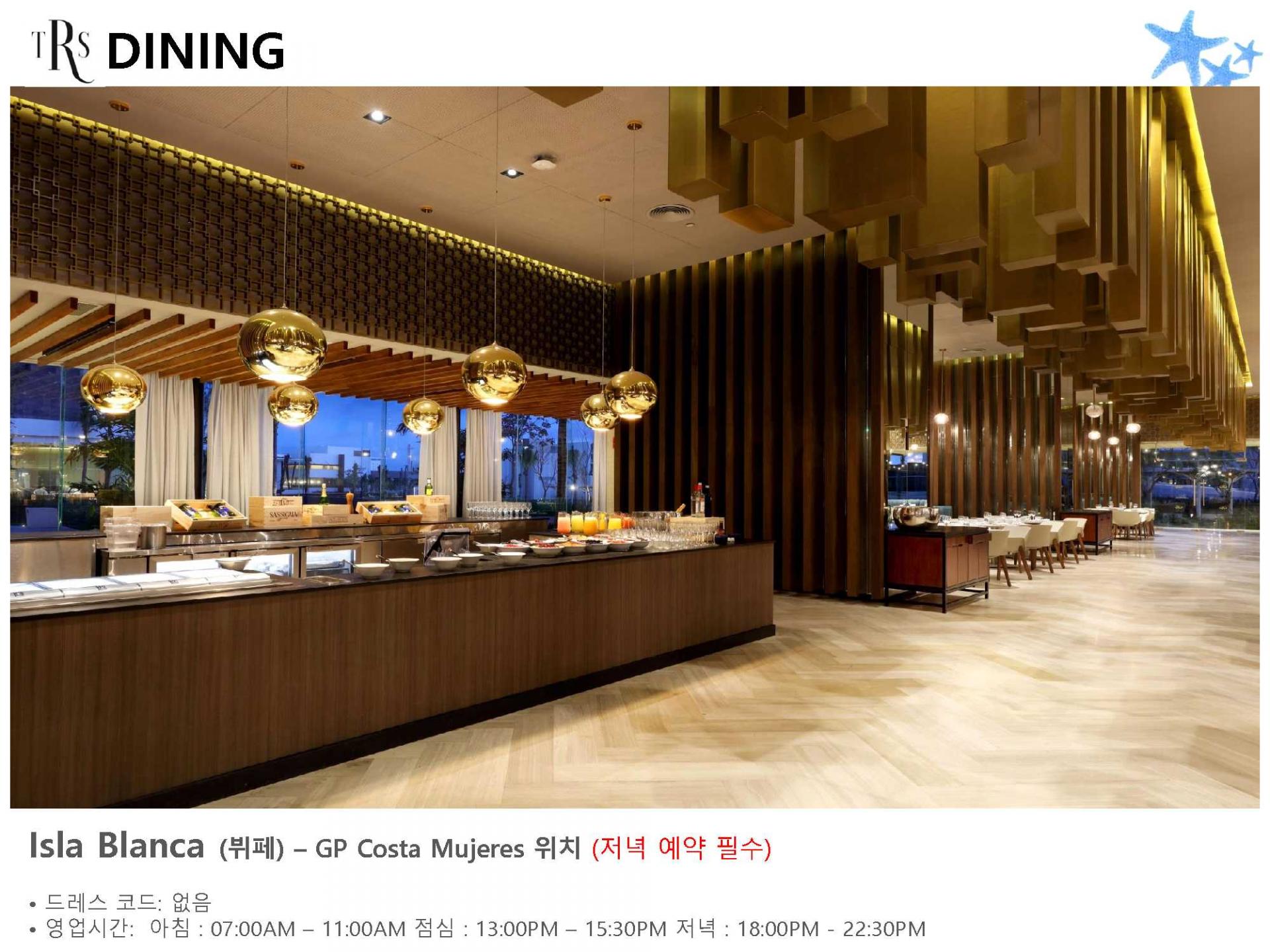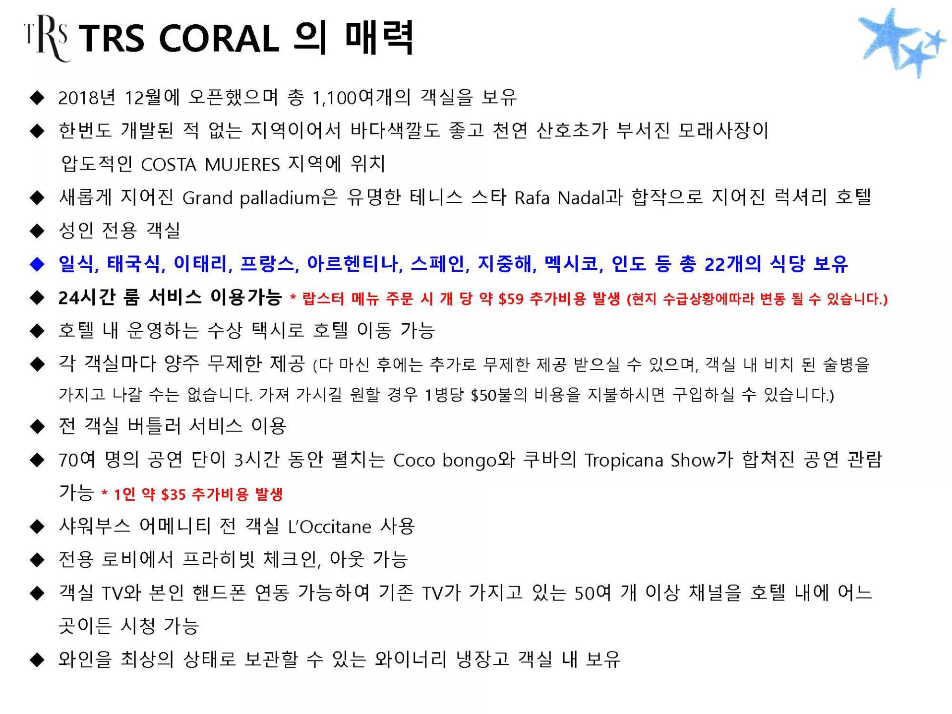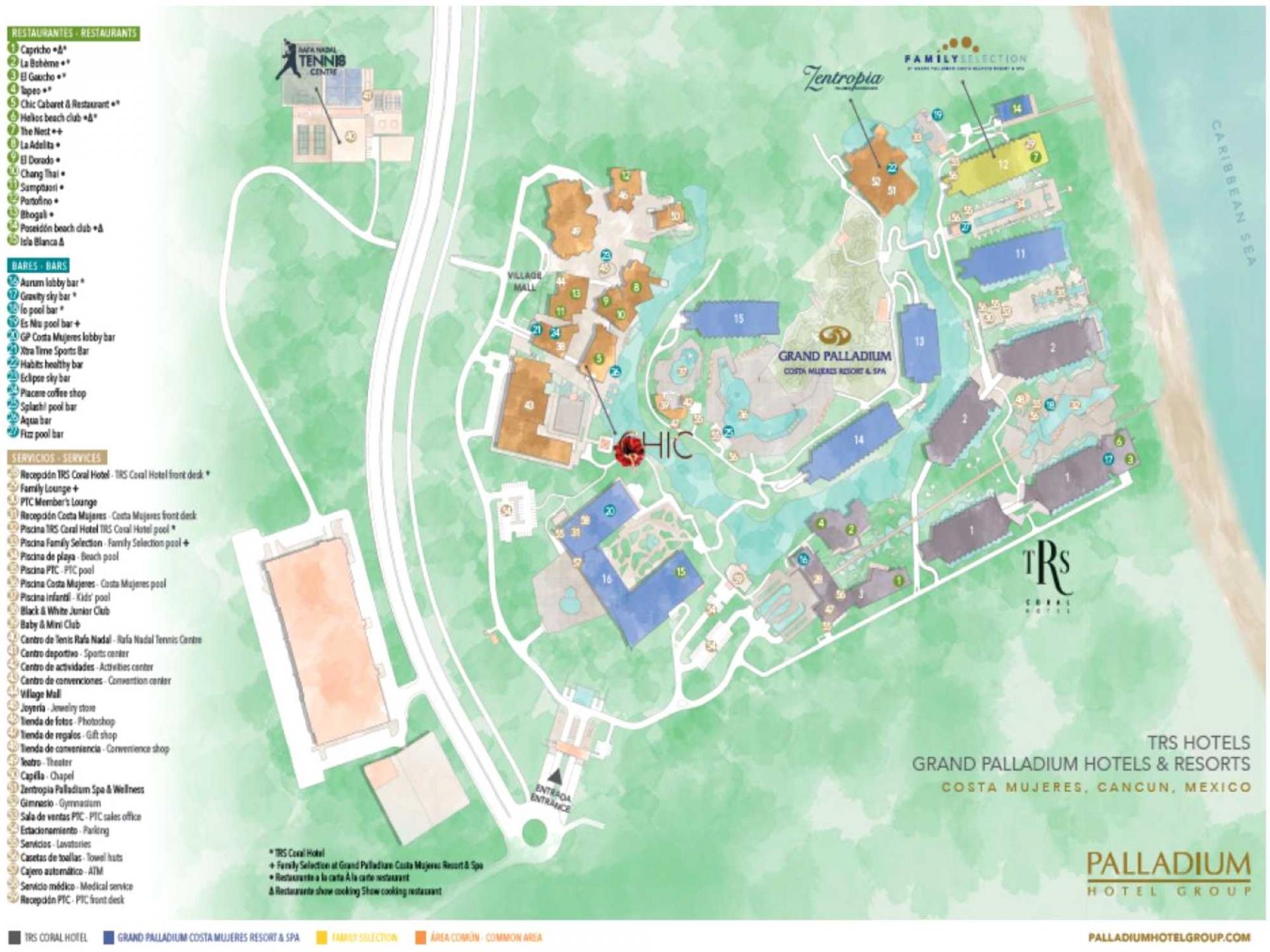 리조트 특징 | * 2018년 12월에 오픈했으며 총 1,100여개의 객실을 보유 * 한번도 개발된 적 없는 지역이어서 바다색깔도 좋고 천연 산호초가 부서진 모래사장이 압도적인 COSTA MUJERES 지역에 위치 * 새롭게 지어진 Grand palladium은 유명한 테니스 스타 Rafa Nadal과 합작으로 지어진 럭셔리 호텔 * 성인 전용 객실 * 일식, 태국식, 이태리, 프랑스, 아르헨티나, 스페인, 지중해, 멕시코, 인도 등 총 22개의 식당 보유 * 24시간 카트 서비스 * 호텔 내 운영하는 수상 택시로 호텔 이동 가능 * 각 객실마다 양주 무제한 제공 (다 마신 후에는 추가로 무제한 제공 받으실 수 있으며, 객실 내 비치 된 술병을 가지고 나갈 수는 없습니다. 가져 가시길 원할 경우 1병당 $50불의 비용을 지불하시면 구입하실 수 있습니다.) * 전 객실 버틀러 서비스 이용 * Helios 레스토랑에서 랍스터 제공 (디너 때만 & 현지 사정에 의해 재고가 없을 경우 제공 안될 수 있습니다.) * 70여 명의 공연 단이 3시간 동안 펼치는 Coco bongo와 쿠바의 Tropicana Show가 합쳐진 공연 관람 가능 * 샤워부스 어메니티 전 객실 L’Occitane 사용 * 전용 로비에서 프라히빗 체크인, 아웃 가능 * 객실 TV와 본인 핸드폰 연동 가능하여 기존 TV가 가지고 있는 50여 개 이상 채널을 호탤 내에 어느 곳이든 시청 가능 * 와인을 최상의 상태로 보관할 수 있는 와이너리 냉장고 객실 내 보유 |