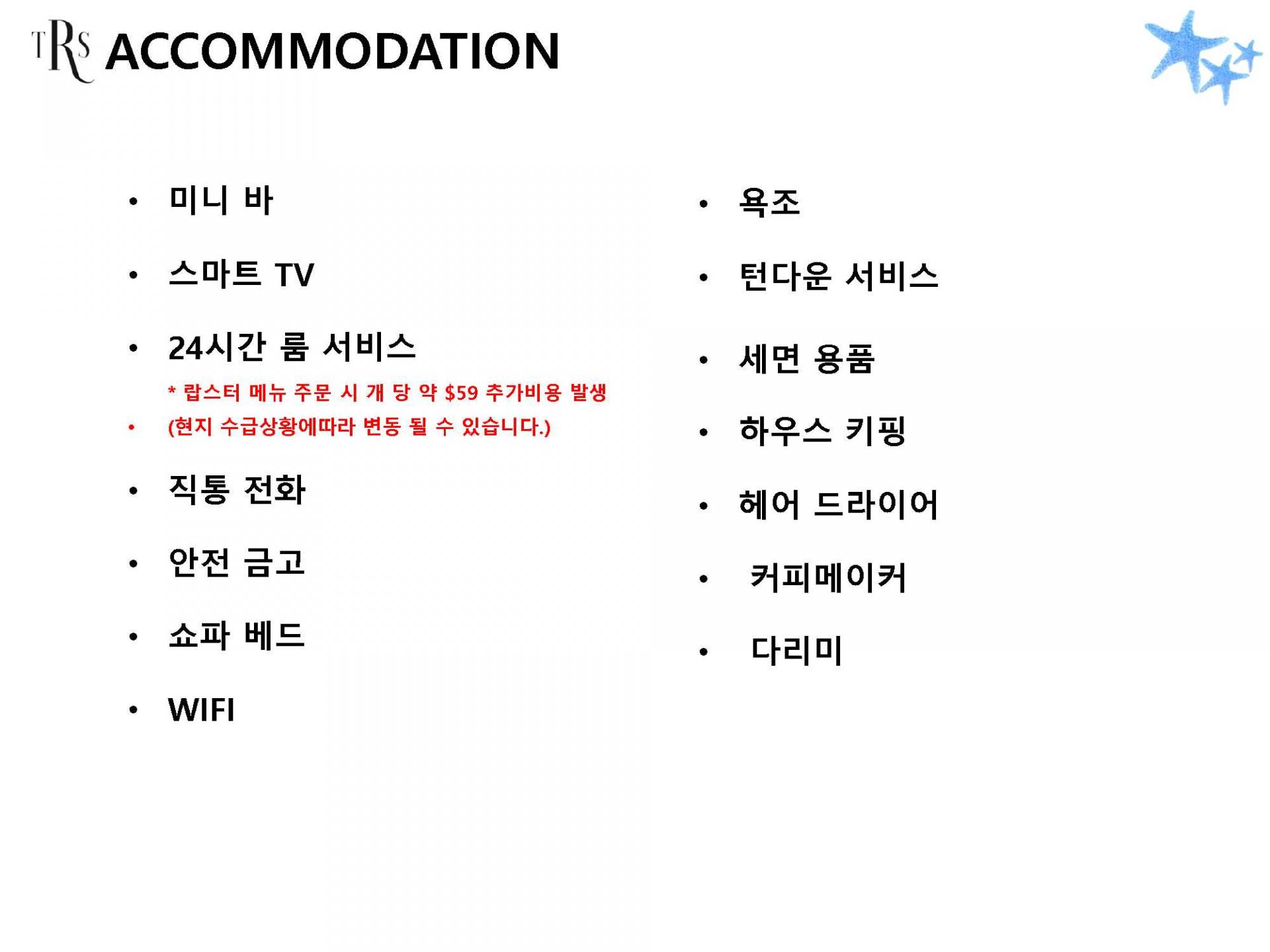리조트 특전 | 1. 체크 인 시 객실 가능 할 경우 무료 룸 업그레이드 2. 계절 과일 3. 샴페인 1병 4. 마사지 15% 할인 (특전은 호텔 사정 상 사전 공지 없이 변경 될 수 있습니다.) |