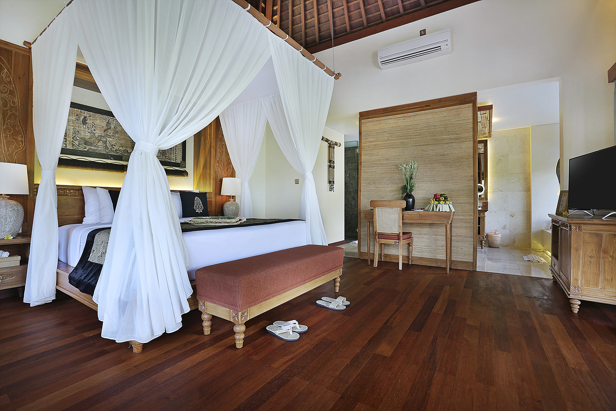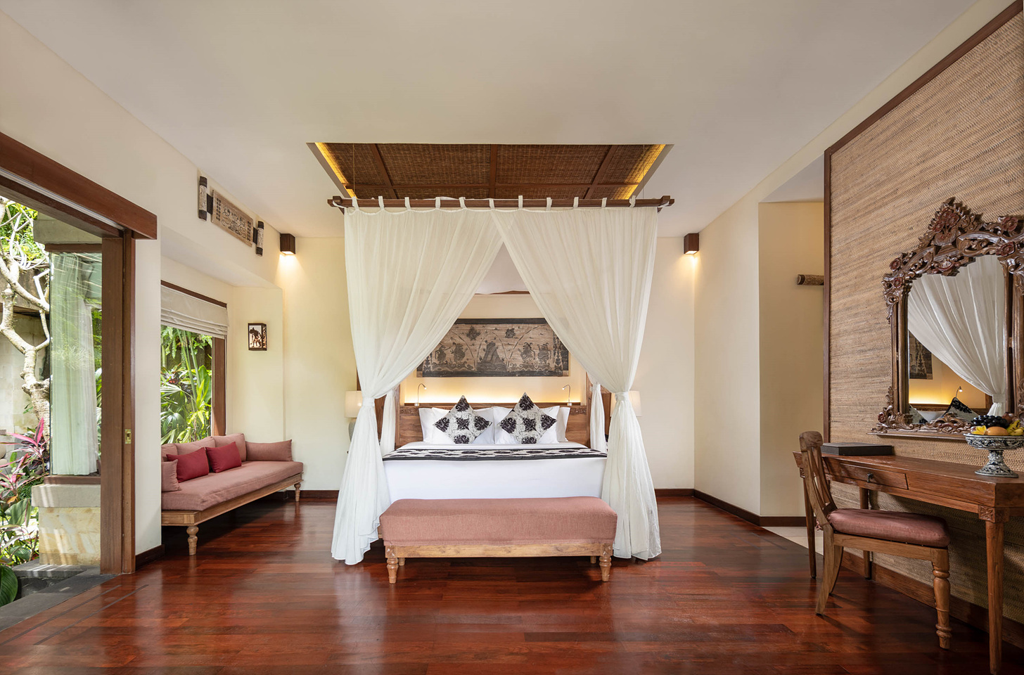 - 개인 프라이빗 풀빌라와 발리 전통 디자인이 조화를 이룬 세련된 인테리어.