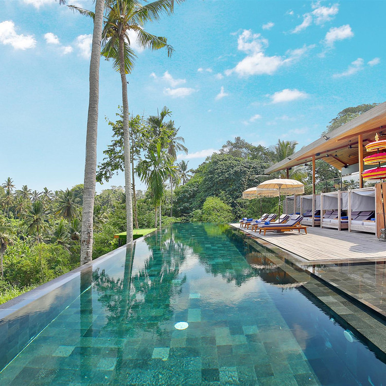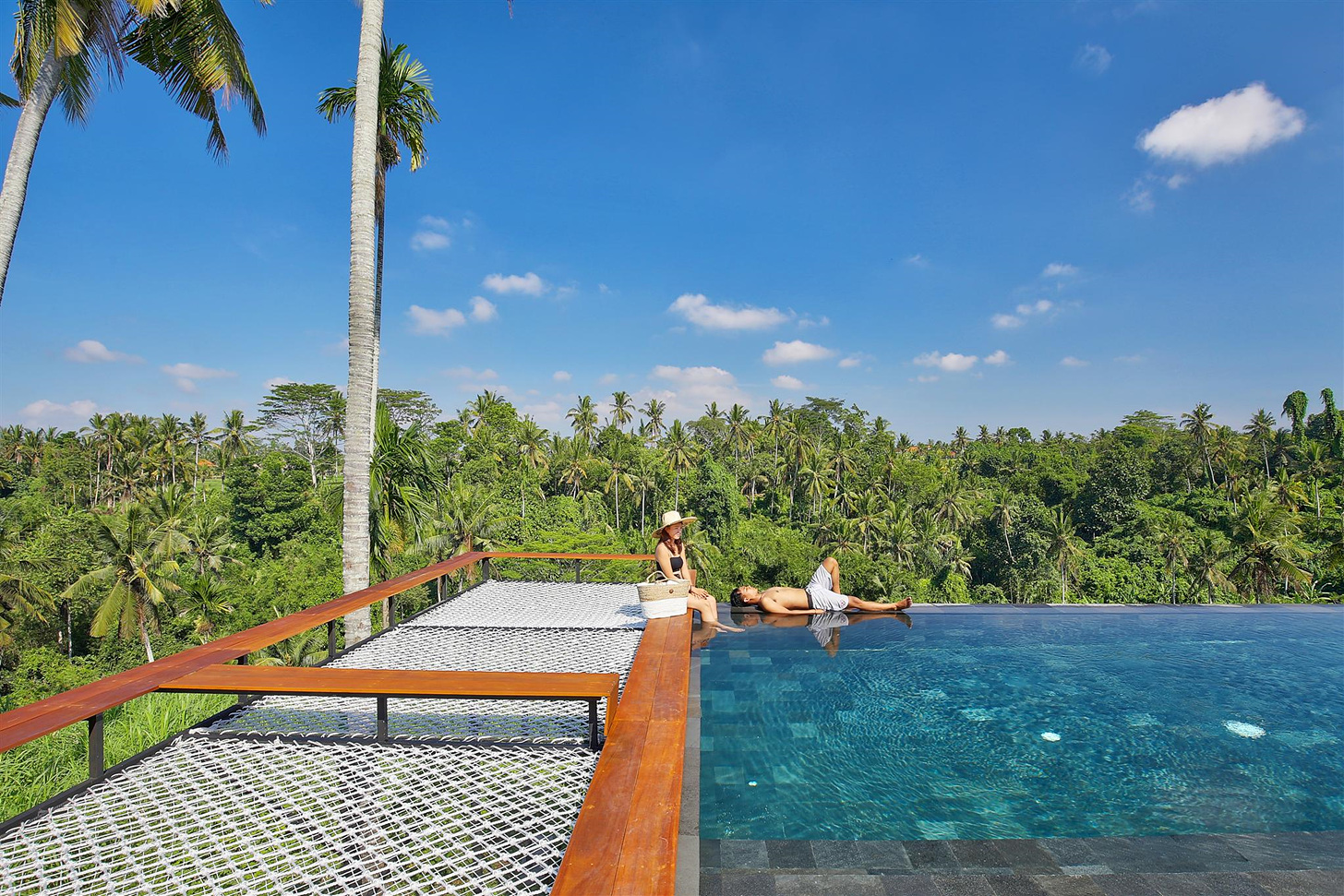 - 열대 숲과 하늘을 배경으로 한 공용 인피니티 풀에서의 여유로운 시간.